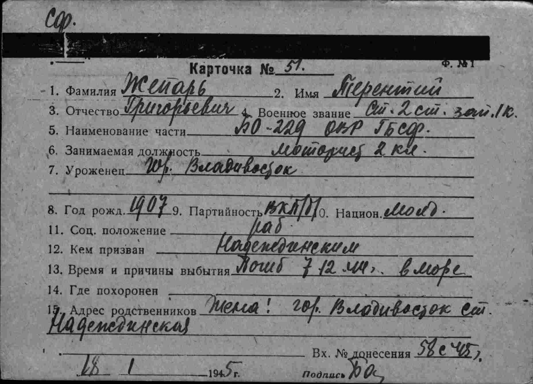 Место призыва Надеждинский РВК, г. Владивосток, ст. Надеждинская