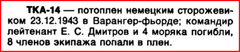 ТКА-14 — потоплен немецким сторожевиком 23.12.1943 в Варангер-фьорде; командир лейтенант Е. С. Дмитров и 4 моряка погибли, 8 членов экипажа попали в плен.