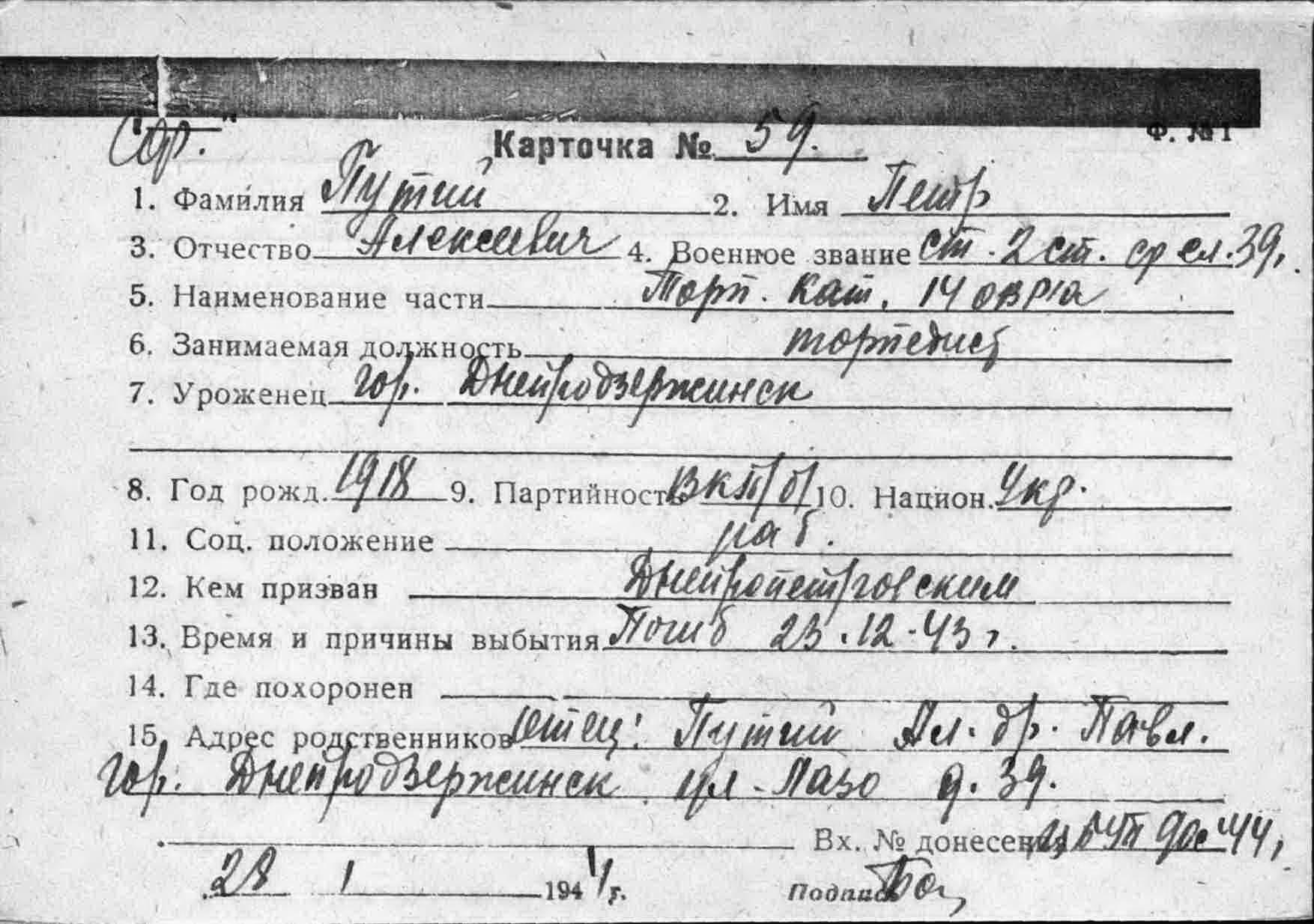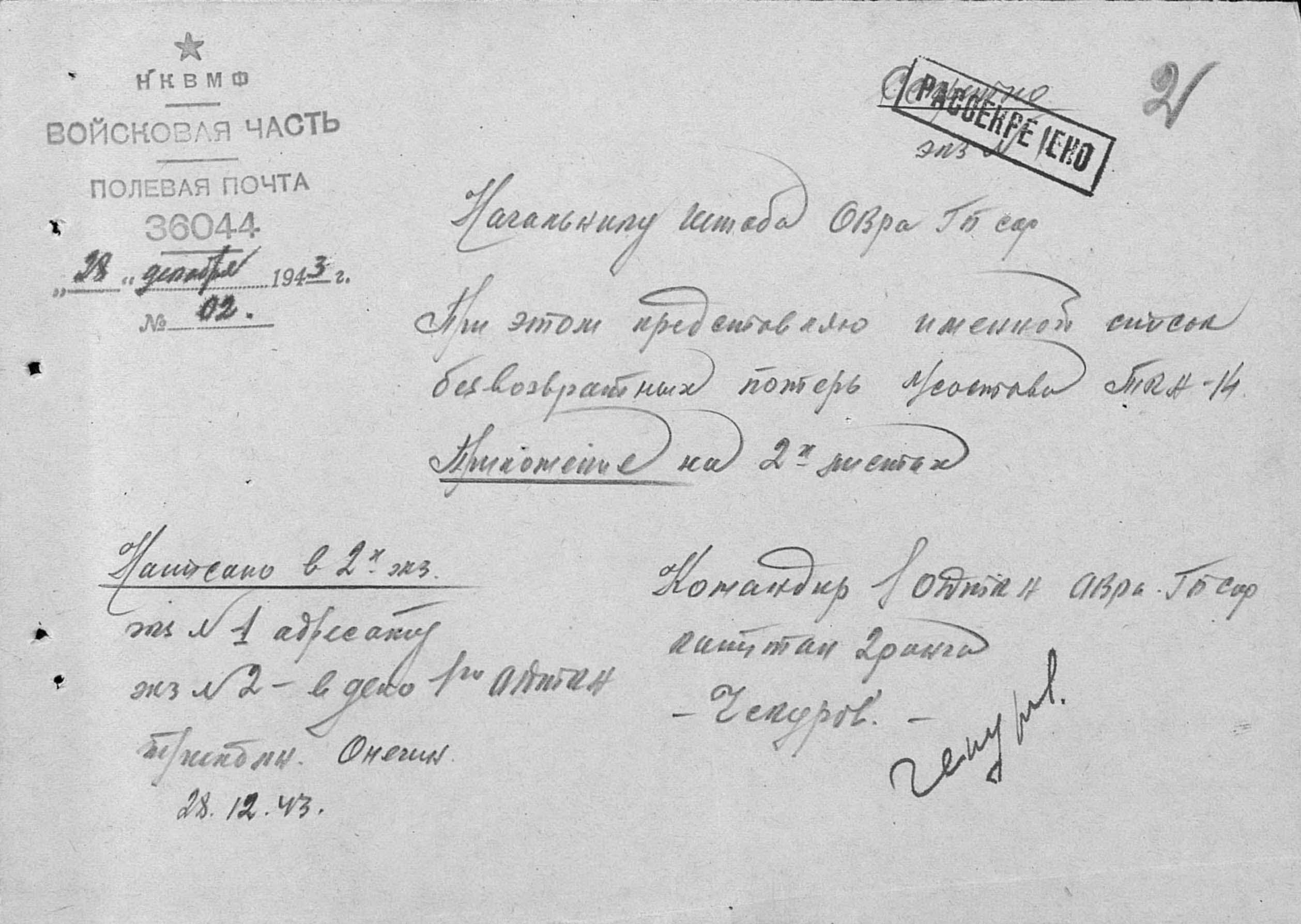 Полевая почта 36044 28 декабря 1943 г. № 02