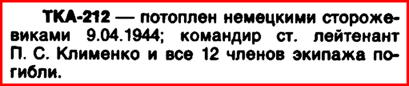 ТКА-212 — потоплен немецкими сторожевиками 9.04.1944; командир ст. лейтенант П. С. Клименко и все 12 членов экипажа погибли.