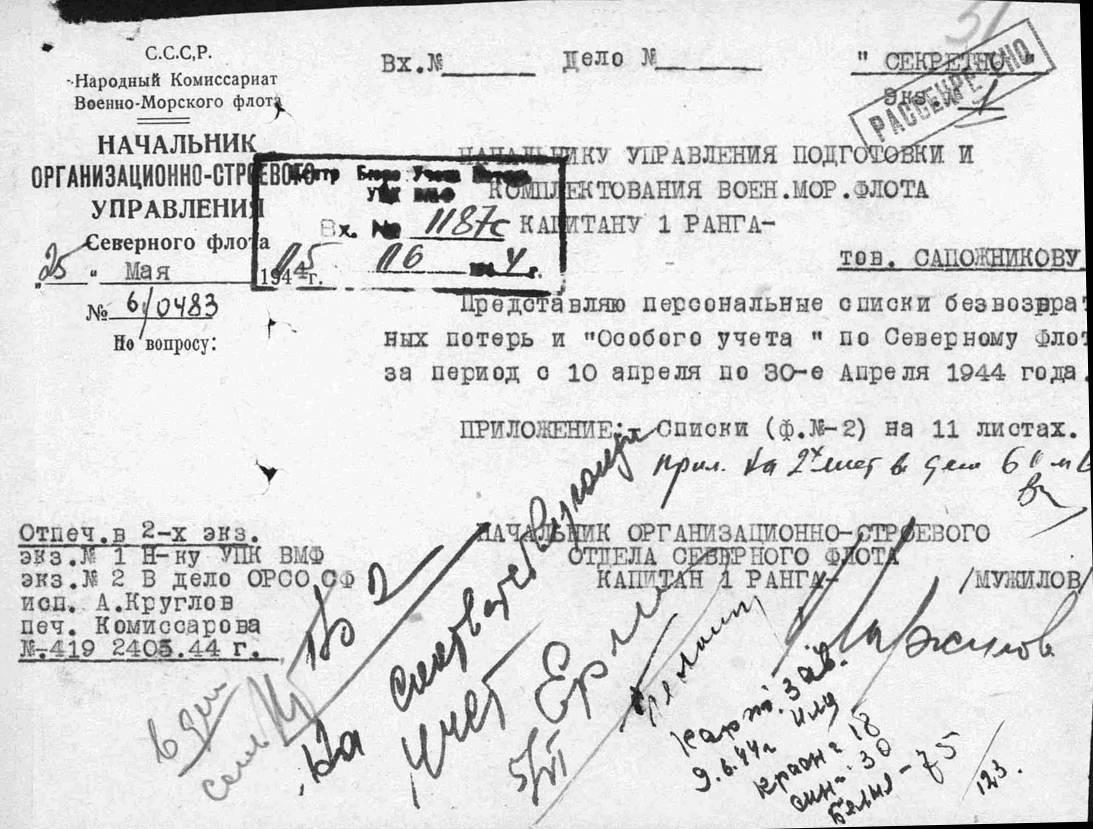 ОРСУ СФ исх.№ 6/0483 от 25.05.1944 г., ЦБУП УПК ВМФ вх.№ 1187с от 05.06.1944 г.