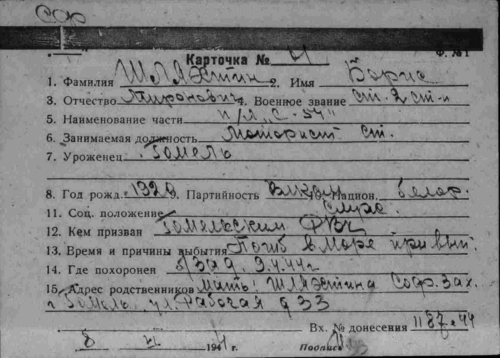 Место призыва Гомельский РВК, Белорусская ССР, Гомельская обл., Гомельский р-н