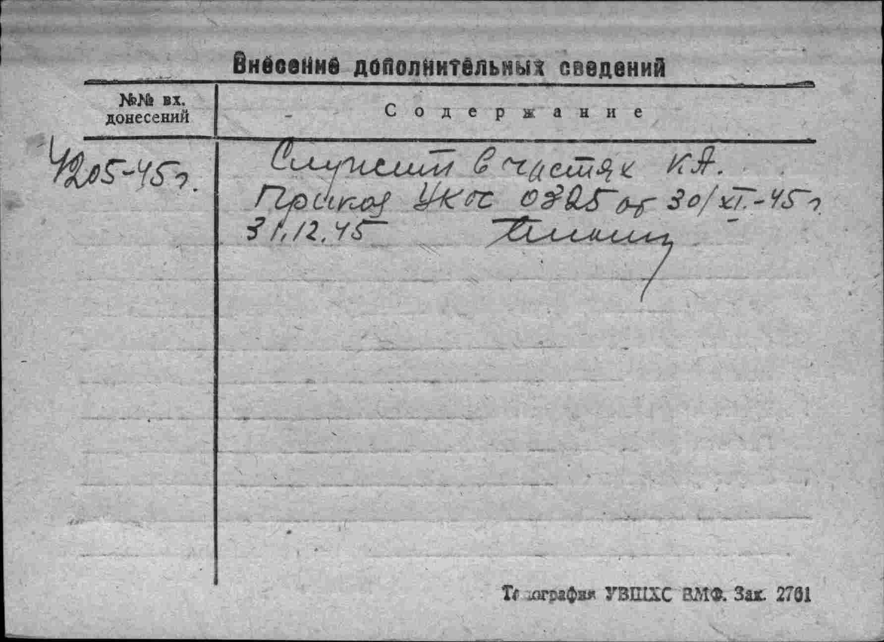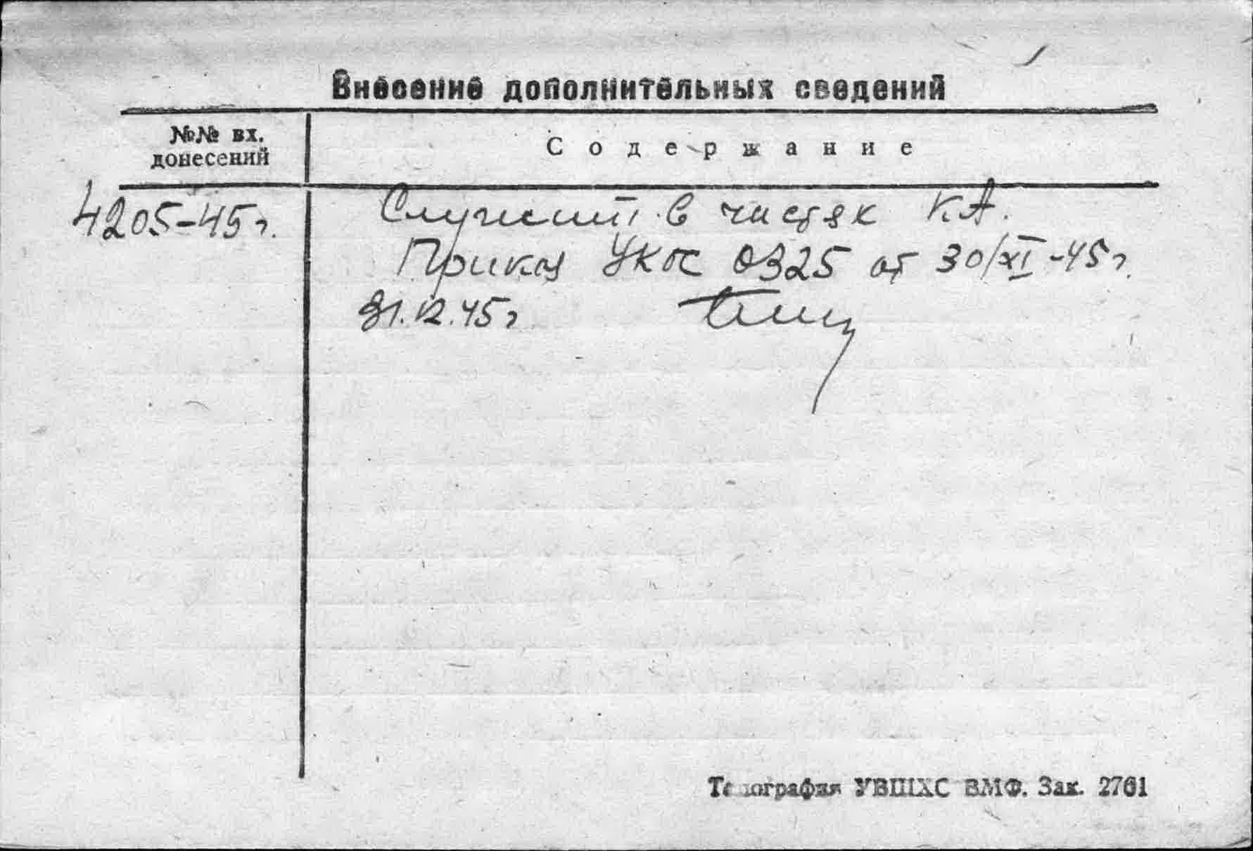 Содержался в лагере военнопленных в Норвегии. Был освобожден и в июле 1945 года и через сборный пункт Нарвик в составе эшелона № 11 отправлен в шведский порт Лулео, оттуда морским путем на финском морском транспорте по Балтискому морю в Финляндию и - далее в СССР. В августе 1945 года во 2 минометной роте минометного батальона 2 учебного стрелкового полка 47 учебной стрелковой дивизии Приволжского военного округа прошел спецпроверку. Приказом НУКОС ВМФ № 0231 от 09.09.1944 г. был исключен из списков ВМФ, как пропавший без вести. Приказом НУКОС ВМФ № 0325 от 30.11.1945 г. числится в частях Красной Армии с августа 1945 г. Дальнейшая его судьба неизвестна.