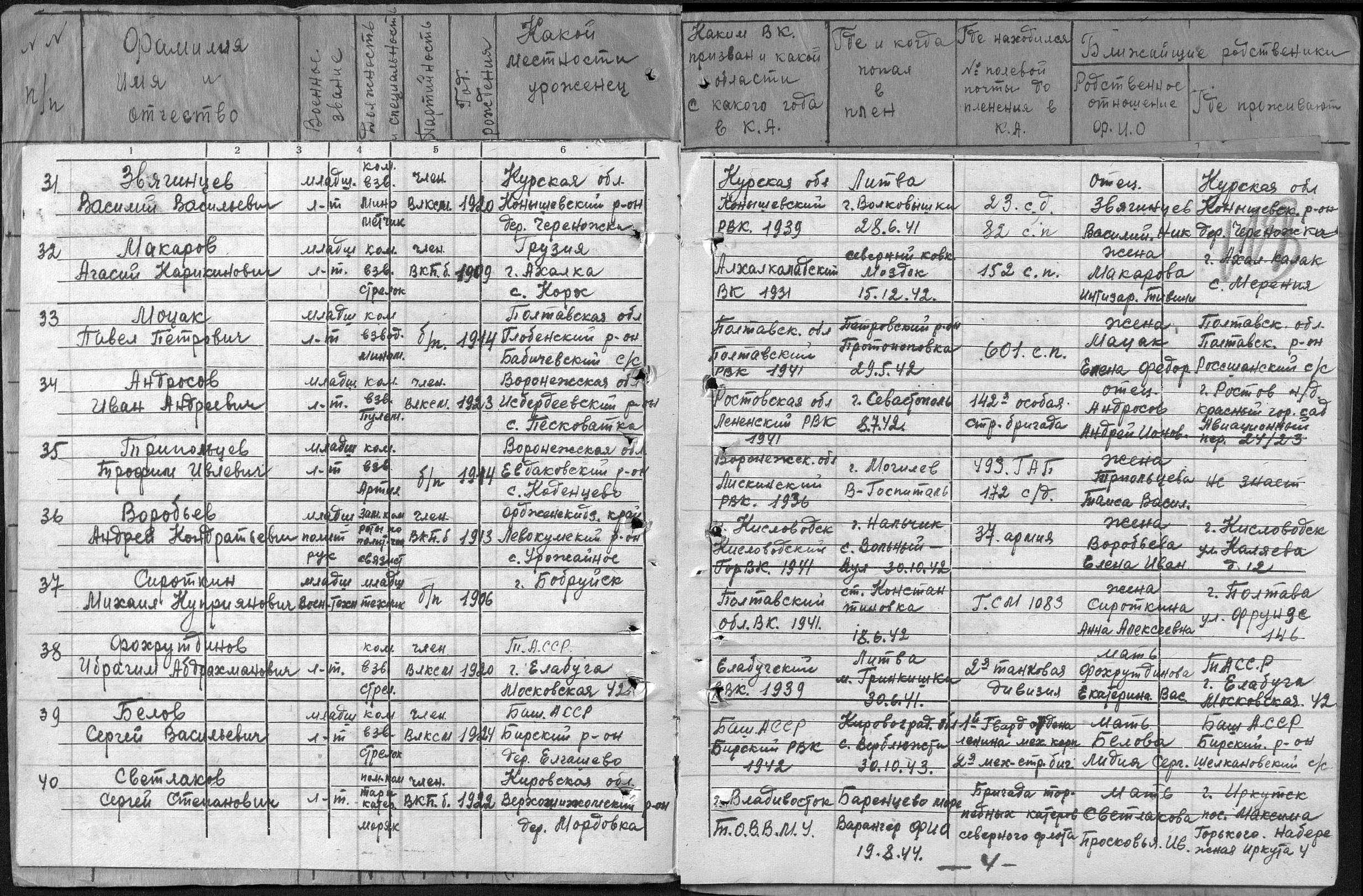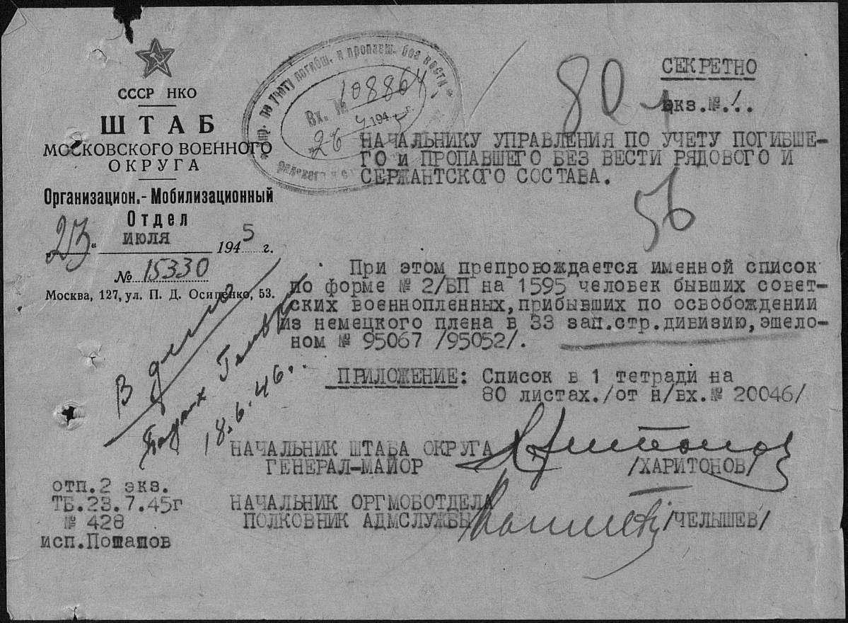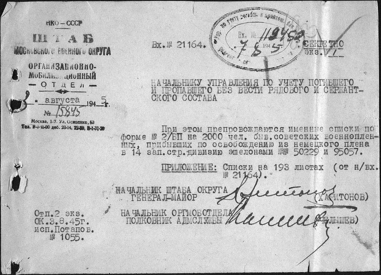 Донесения об освобожденных из плена №119452 07.08.1945 Штаб Московского ВО