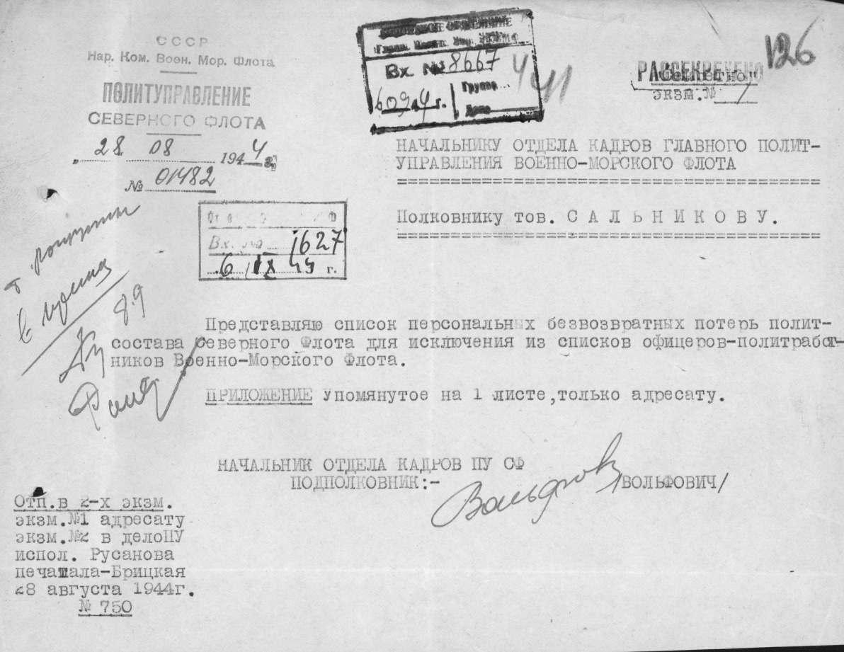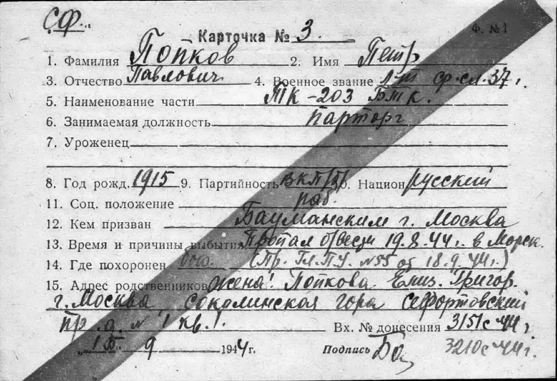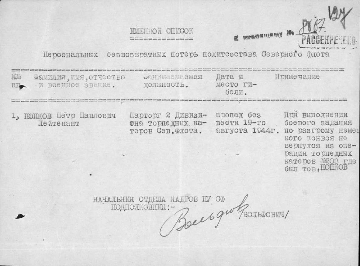 — Подошли немецкие катера. Нас расстреливают. Катер тонет. Прощайте!... На этом связь прекратилась. Уже глубокой осенью, после изгнания немецко-фашистских войск из района Тромсе, узники находившегося там лагеря смерти сообщили нам некоторые подробности гибели экипажа Карташева — все, что они узнали от раненых матросов катера, доставленных в лагерь и погибших здесь.