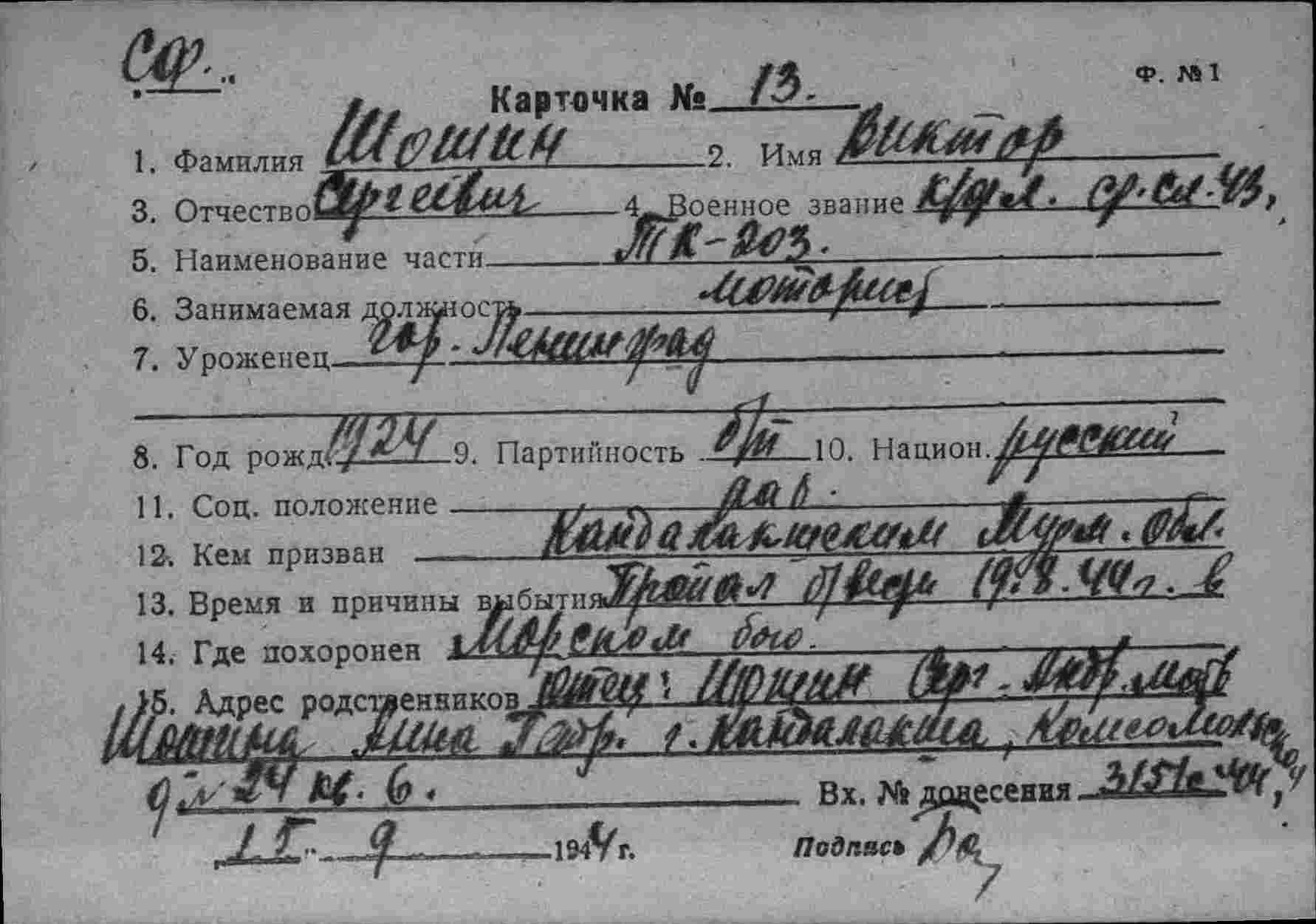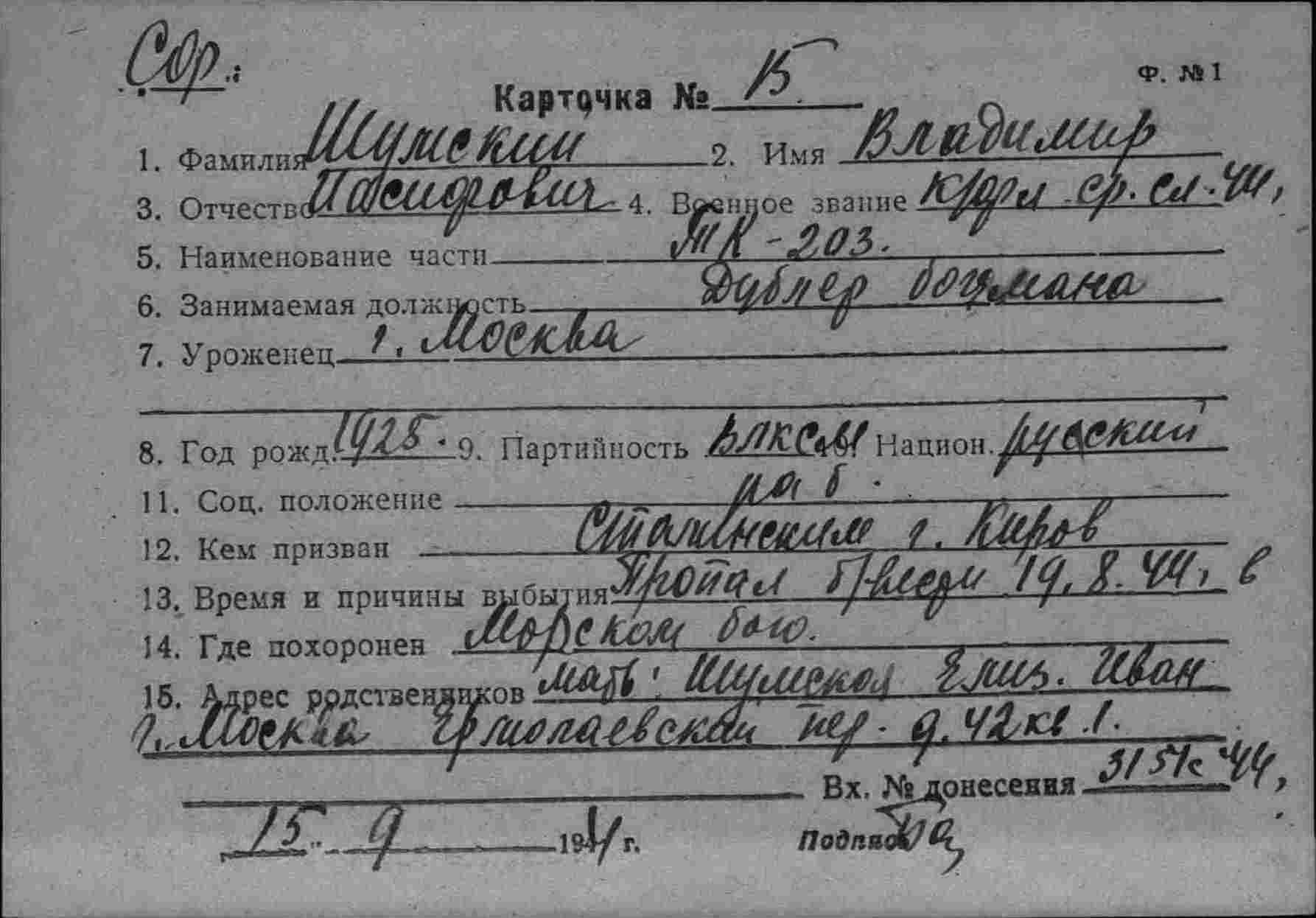 краснофлотец Шумский В.И. Содержался в лагере военнопленных в Норвегии. После освобождения, в июле 1945 года через сборный лагерь из порта Тромсе на шведском пароходе отправлен в советский порт Мурманск. Дальнейшая его судьба неизвестна.