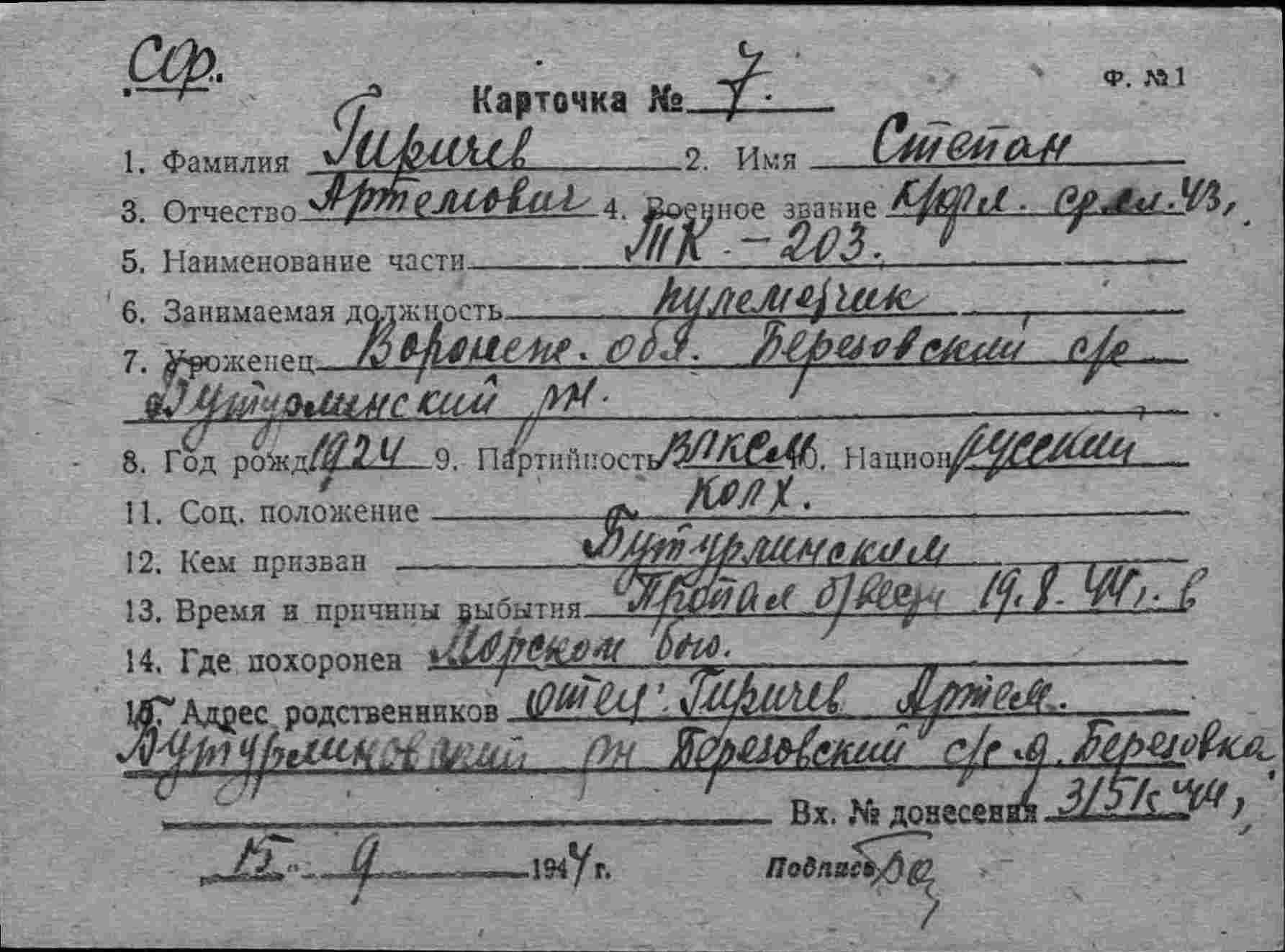 старший краснофлотец Фирсаев Г.И. Содержался в лагере военнопленных в Норвегии. После освобождения, в июле 1945 года через сборный пункт Мелвик в составе железнодорожного эшелона из норвежского города Джесшей (Jessheim) отправлен в шведский морской порт, оттуда морским путем на финском морском транспорте по Балтискому морю в Финляндию и - далее в СССР. Железнодорожным эшелоном № 95067 (95052) доставлен в Московский военный округ. В июле 1945 года в 317 запасном стрелковом полку 33 запасной стрелковой дивизии Московского военного округа прошел спецпроверку. Дальнейшая его судьба неизвестна.