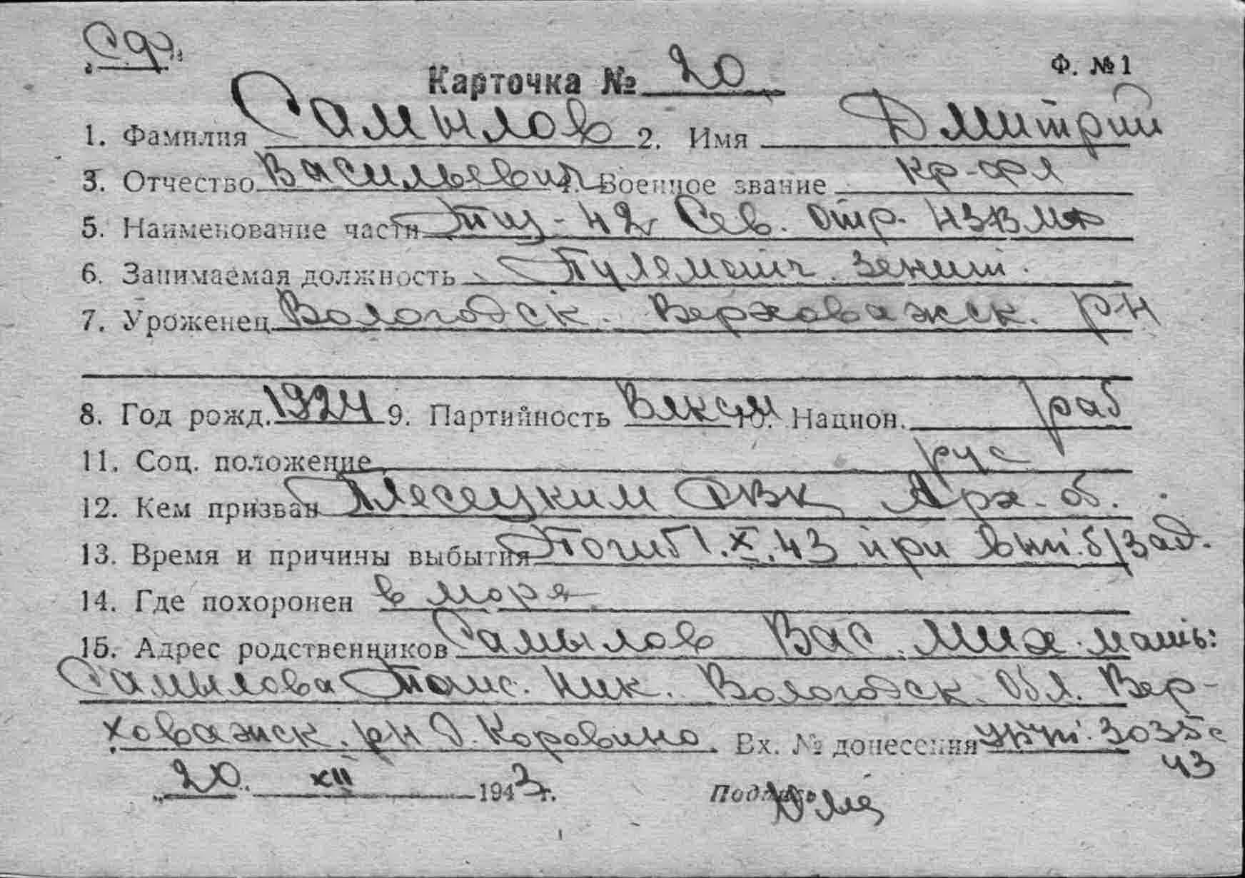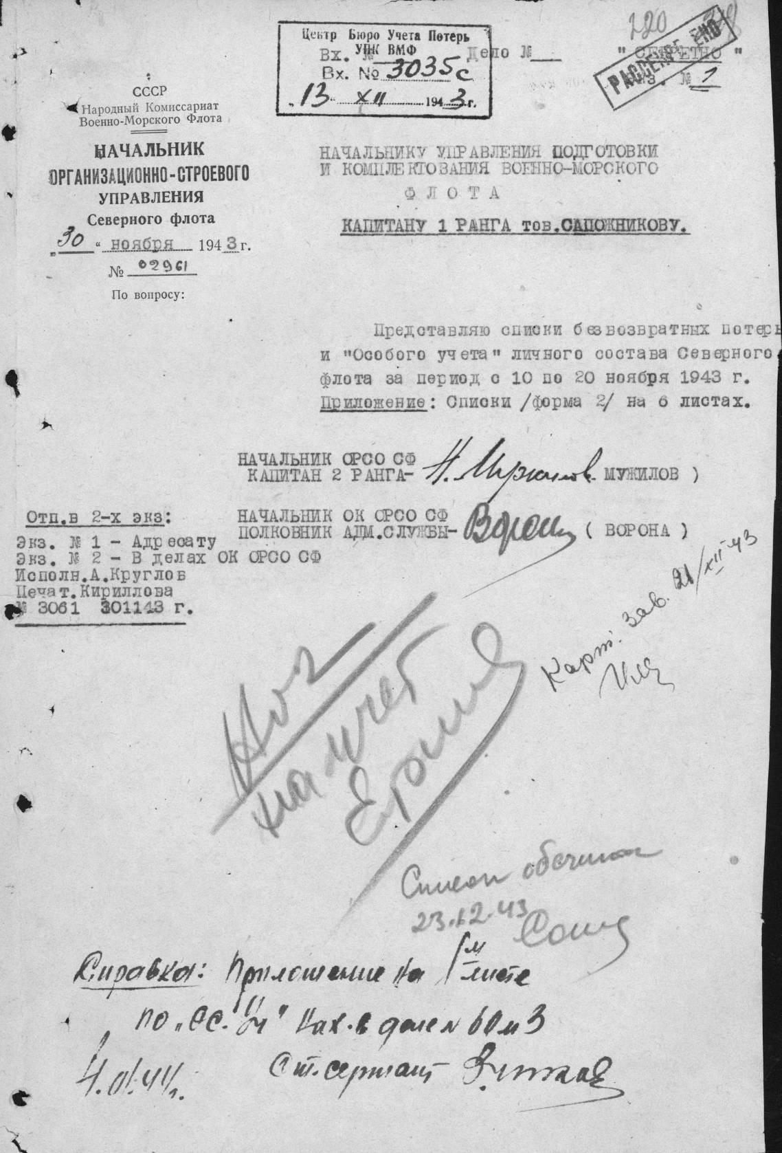 Список безвозвратных потерь № 02961 от 30 ноября 1943 г. ОРСУ СФ