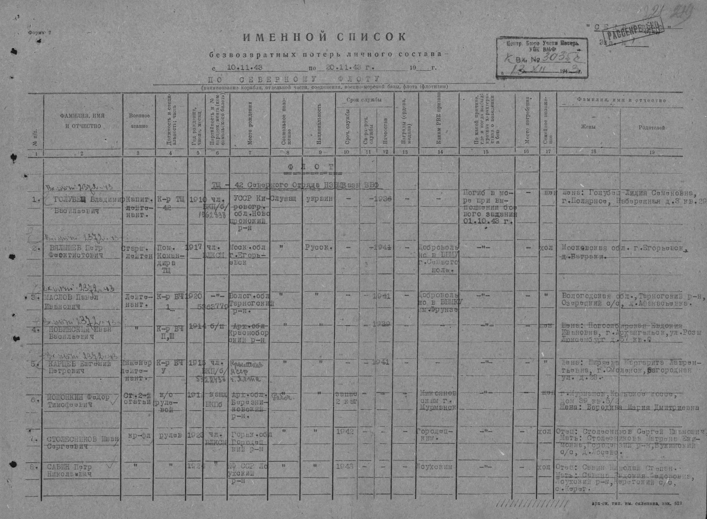 Полный список экипажа тральщика Т-896 (ТЩ-42) погибших 01.10.1943 г. при торпедировании