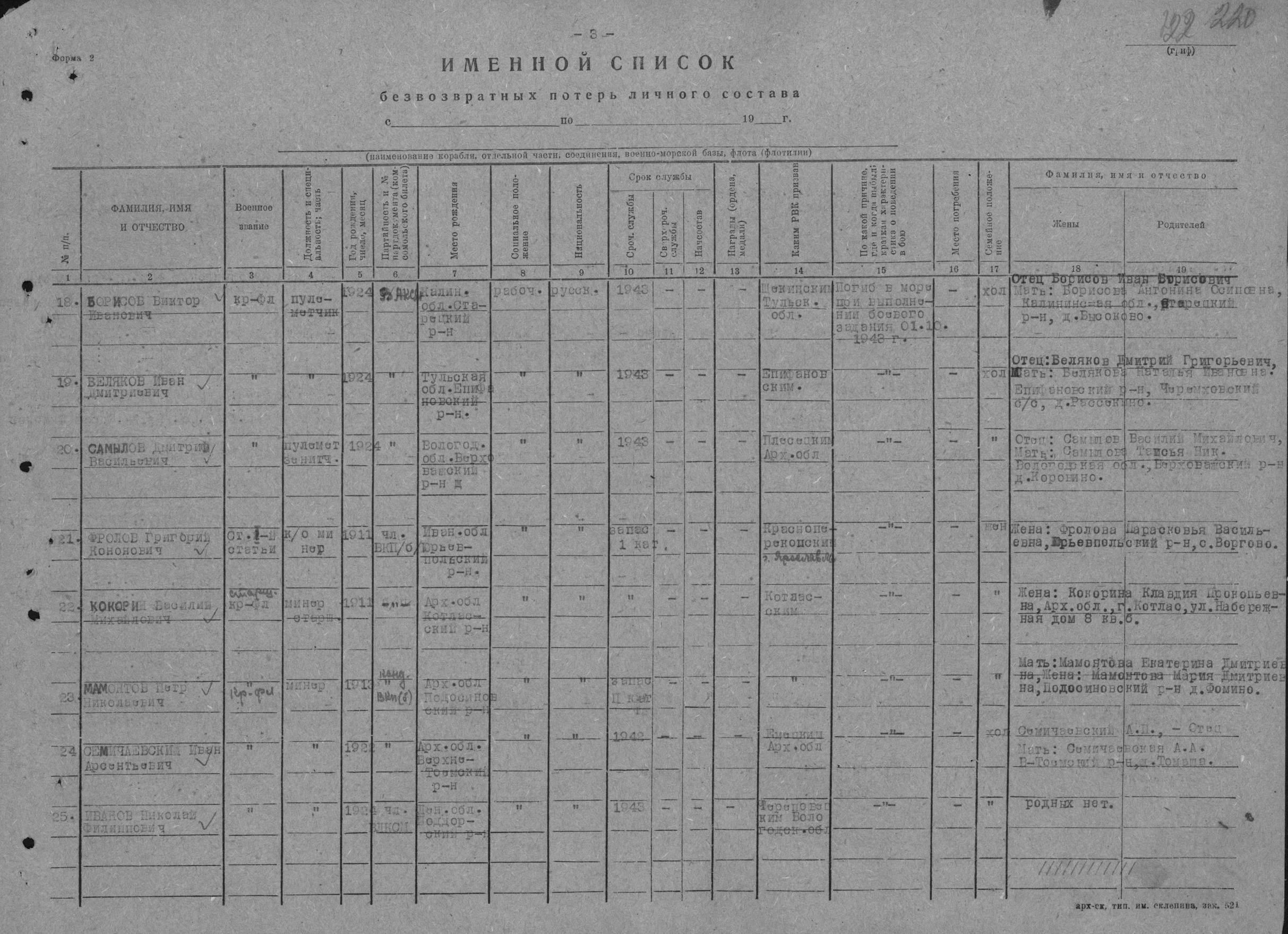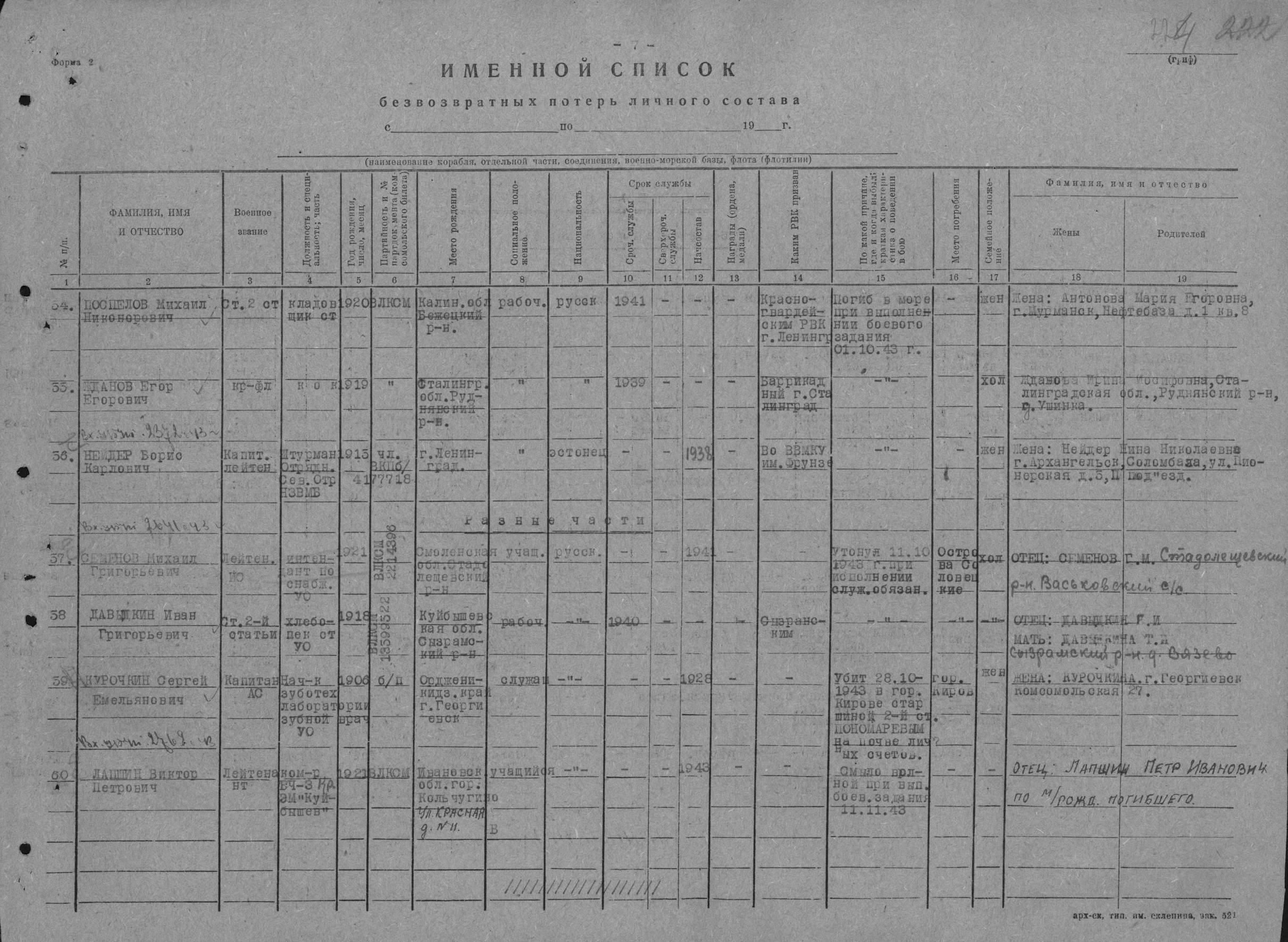Список безвозвратных потерь. № 1287с от 13 октября 1943 г. КО БВФ