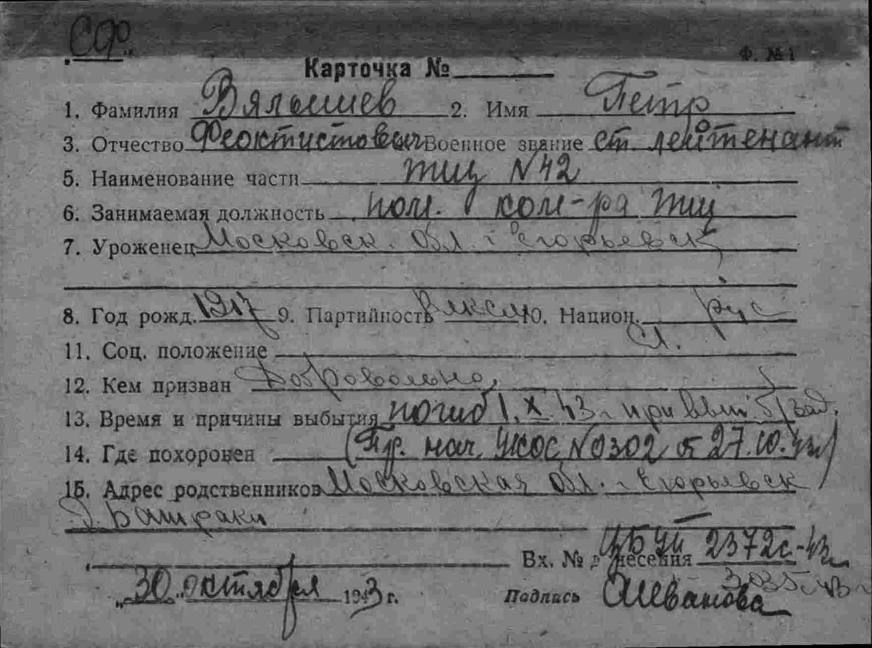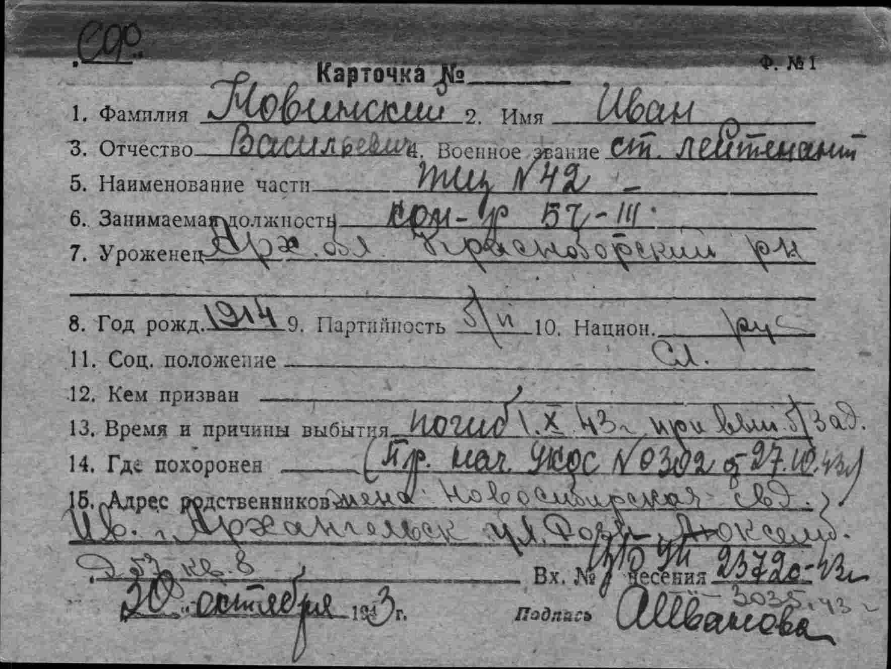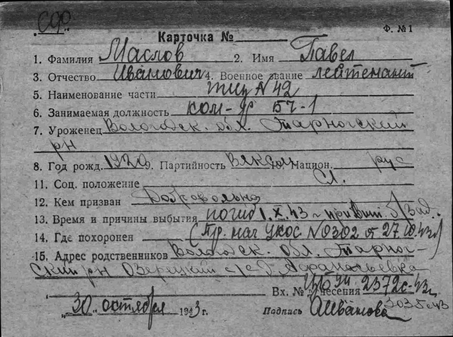 Дата выбытия 01.10.1943