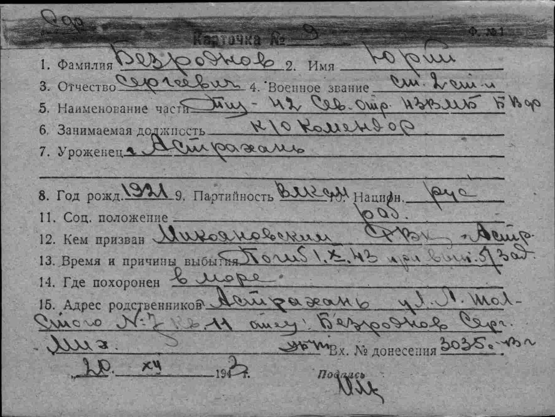 Последнее место службы СФ, ТЩ 42 Сев. отр. НЗВМБ