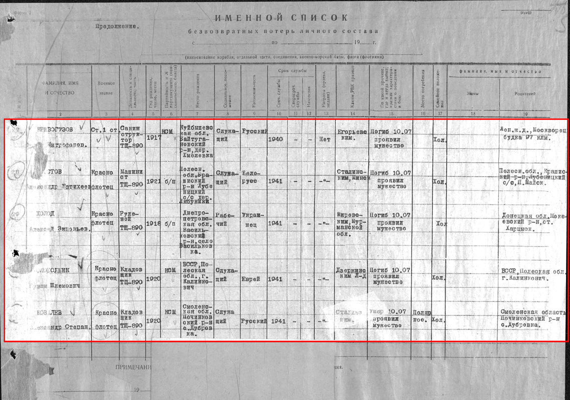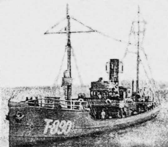 Т-890, бортовой № 18, отмобилизован еще в 1933 г., к началу войны являлся одним из двух тральщиков Северного флота. 9 июля 1941 г. при высадке войск морского десанта в губе Западная Лица в результате удара авиации противника получил повреждения от близких разрывов авиабомб и выбросился на осушку. Во время второго удара авиации получил прямые попадания авиабомб, загорелся и в 17.54 затонул;