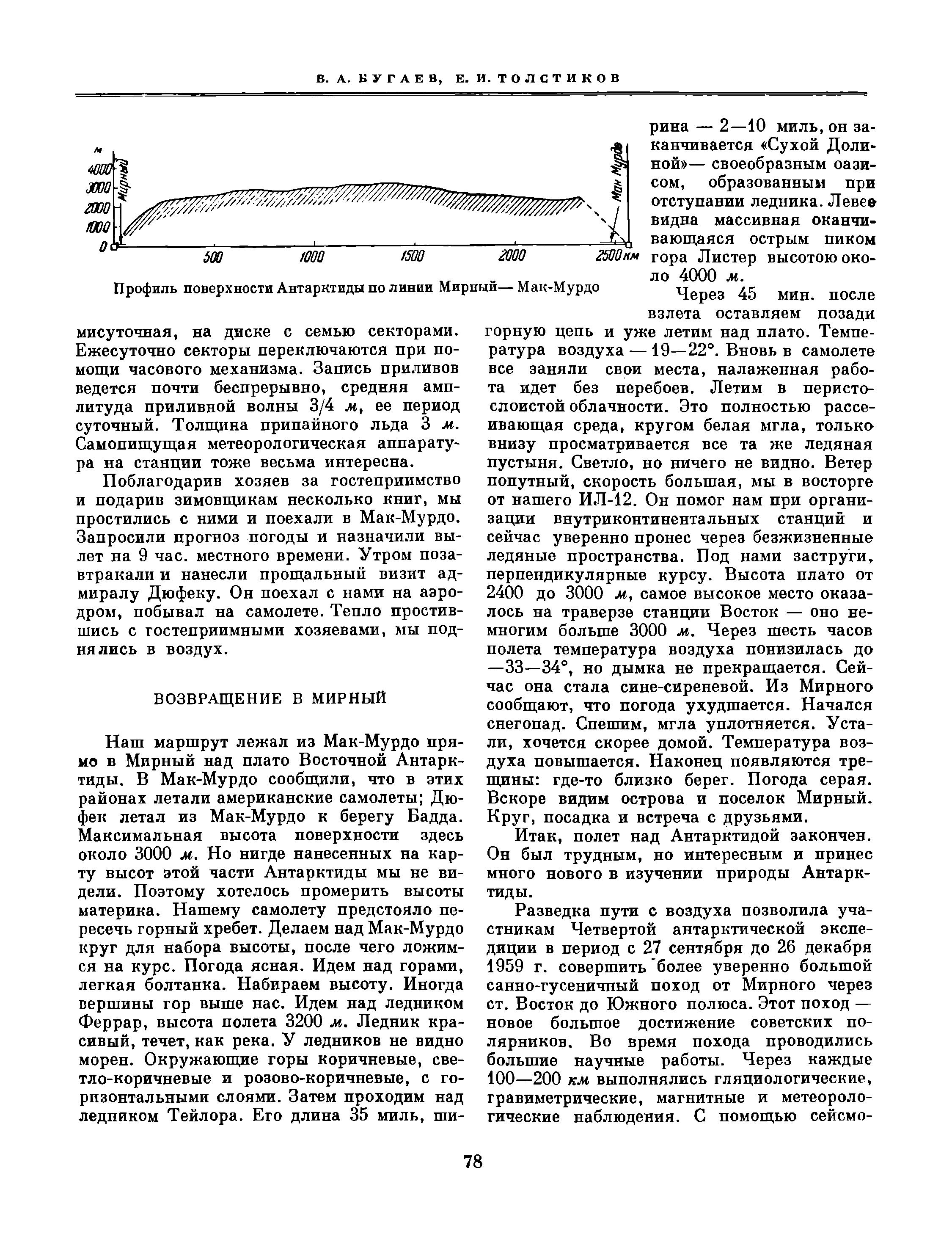 2. Впервые был осуществлен гляциологический разрез от побережья моря Дейвиса до Полюса относительной недоступности протяженностью более 2100 км. Этот разрез был выполнен в начале и конце 1958 г. тремя санногусеничными поездами. Сопоставление данных сейсмического зондирования ледниковой толщи с результатами гравиметрических работ позволило построить подледный профиль Восточной Антарктиды.