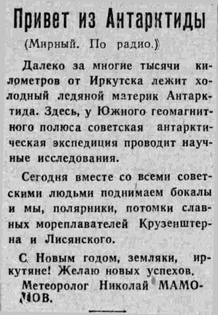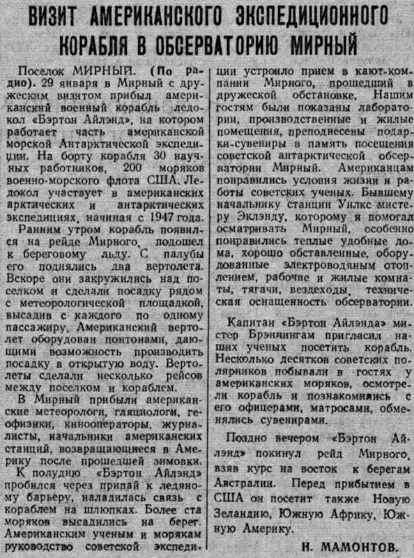 По соглашению между СССР и США в обсерватории Мирный работал американский метеоролог М.Д.Рубин, на станции ЛитлАмерика — синоптик П.Д.Астапенко. В обсерватории Мирный в составе советской экспедиции проводил научные наблюдения чехословацкий геофизик др А.Мркос.
