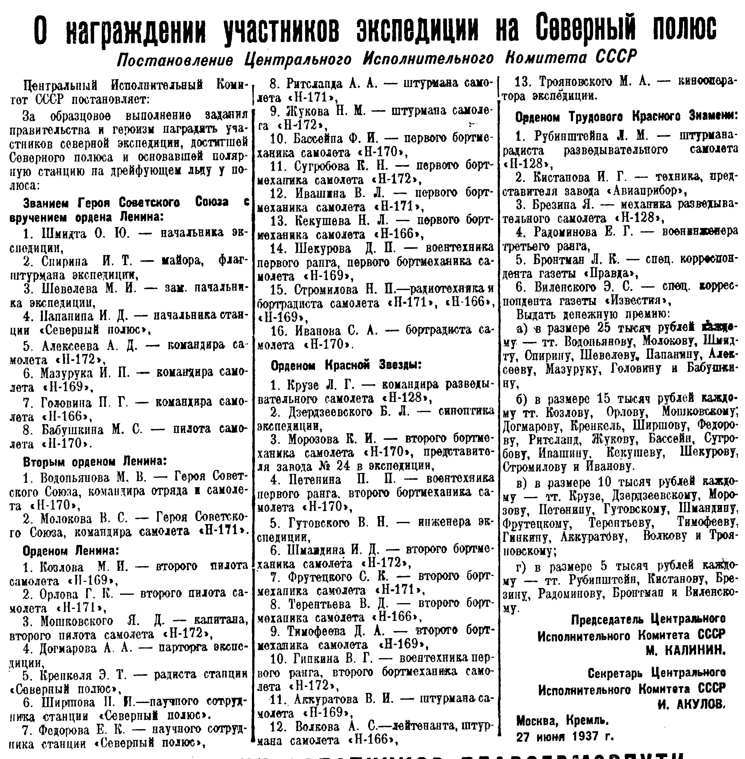 За образцовое выполнение задания правительства и героизм наградить участников северной экспедиции, достигшей Северного полюса и основавшей полярную станцию на дрейфующем льду у полюса: