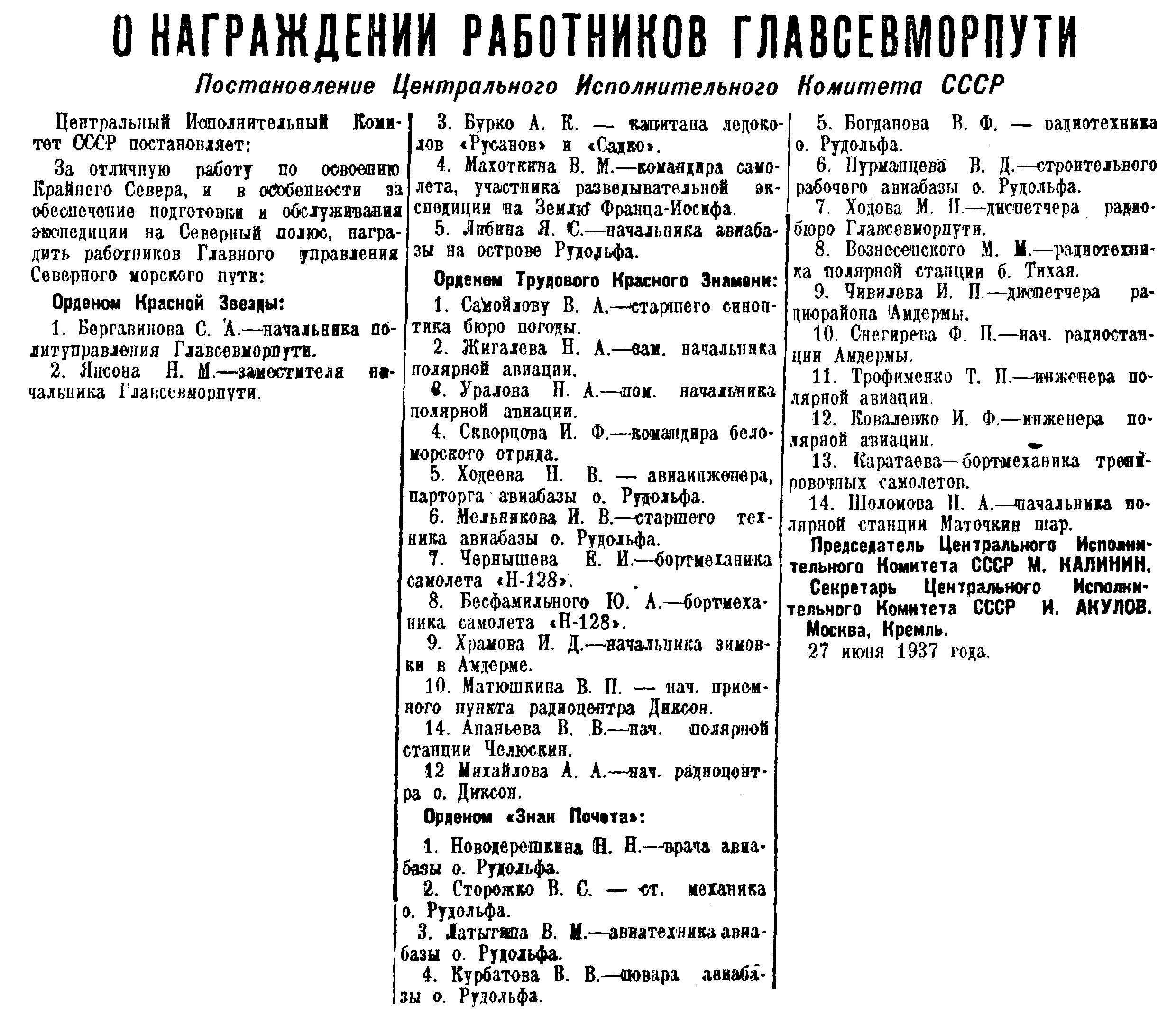 За отличную работу по освоению Крайнего Севера, и в особенности за обеспечение подготовки и обслуживания экспедиции на Северный полюс, наградить работников Главного управления Северного морского пути: