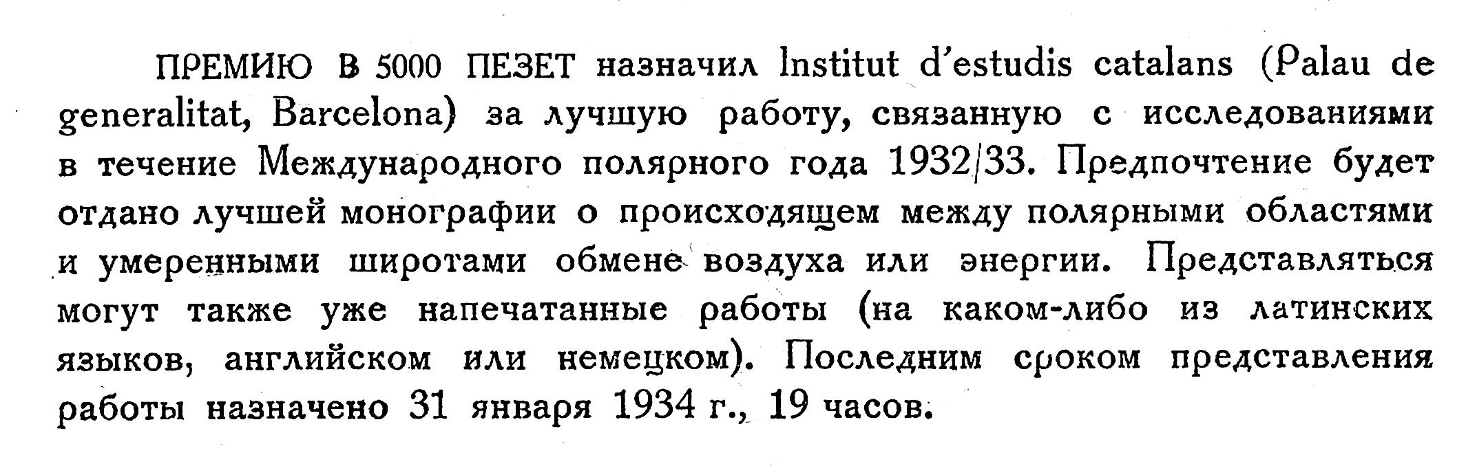 ПРЕМИЮ В 5000 ПЕЗЕТ назначил Institut d'estudis catalans (Palau de generalitat, Barcelona) за лучшую работу, связанную с исследованиями в течение Международного полярного года 1932/33. Предпочтение будет отдано лучшей монографии о происходящем между полярными областями и умеренными широтами обмене воздуха или энергии. Представляться могут также уже напечатанные работы (на каком-либо из латинских языков, английском или немецком). Последним сроком представления работы назначено 31 января 1934 г., 19 часов.