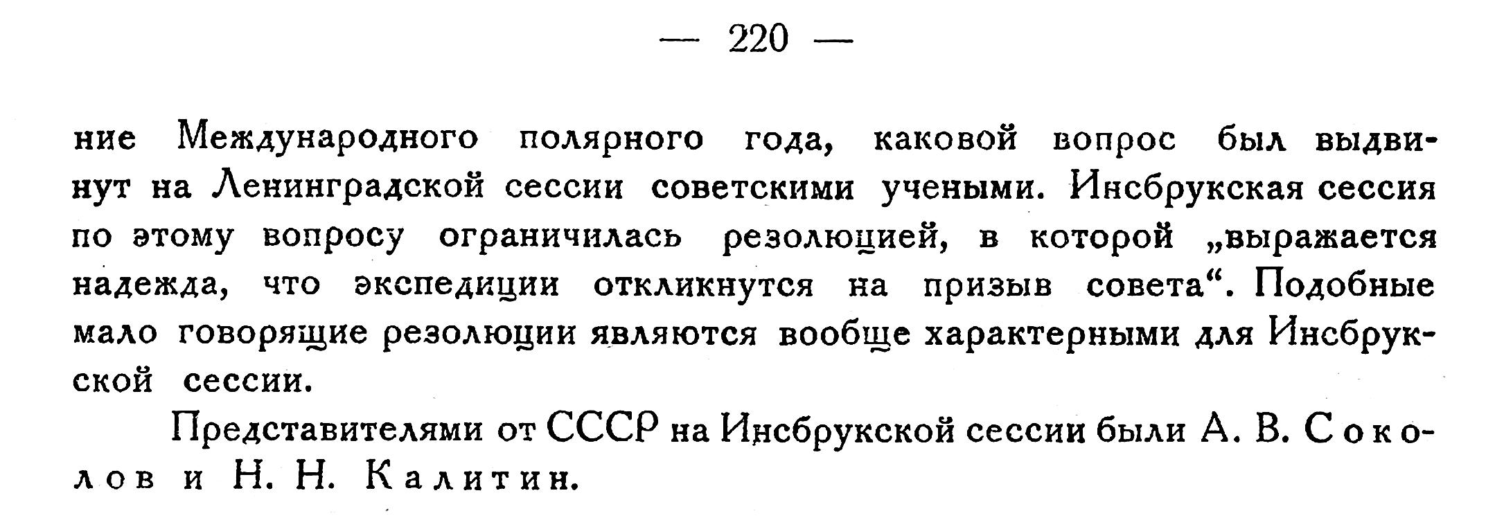 ние Международного полярного года, каковой вопрос был выдвинут на Ленинградской сессии советскими учеными. Инсбрукская сессия по этому вопросу ограничилась резолюцией, в которой „выражается надежда, что экспедиции откликнутся на призыв совета". Подобные мало говорящие резолюции являются вообще характерными для Инсбрукской сессии.