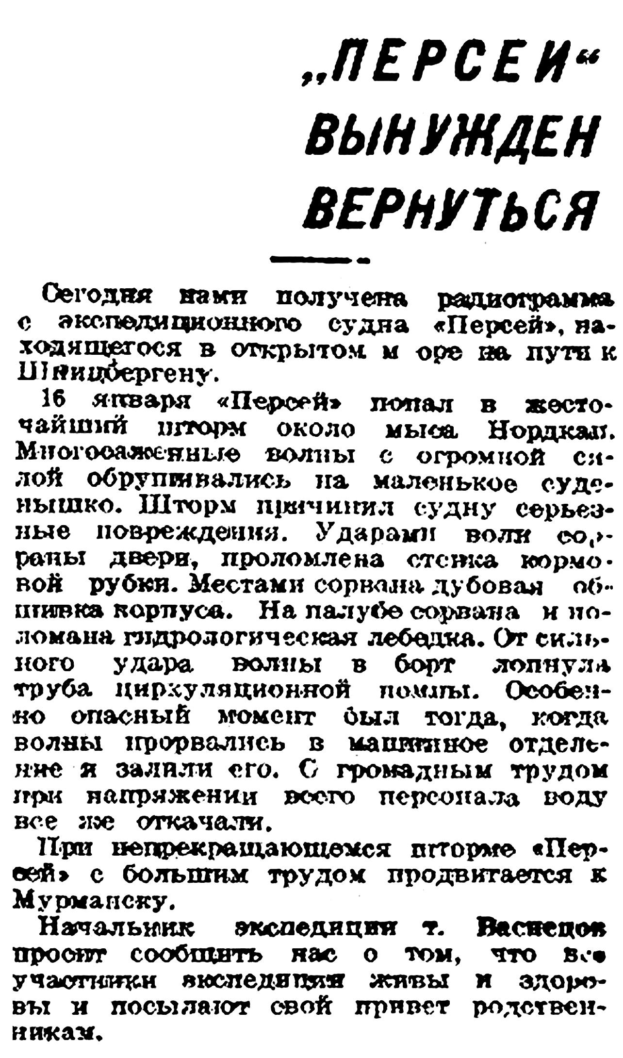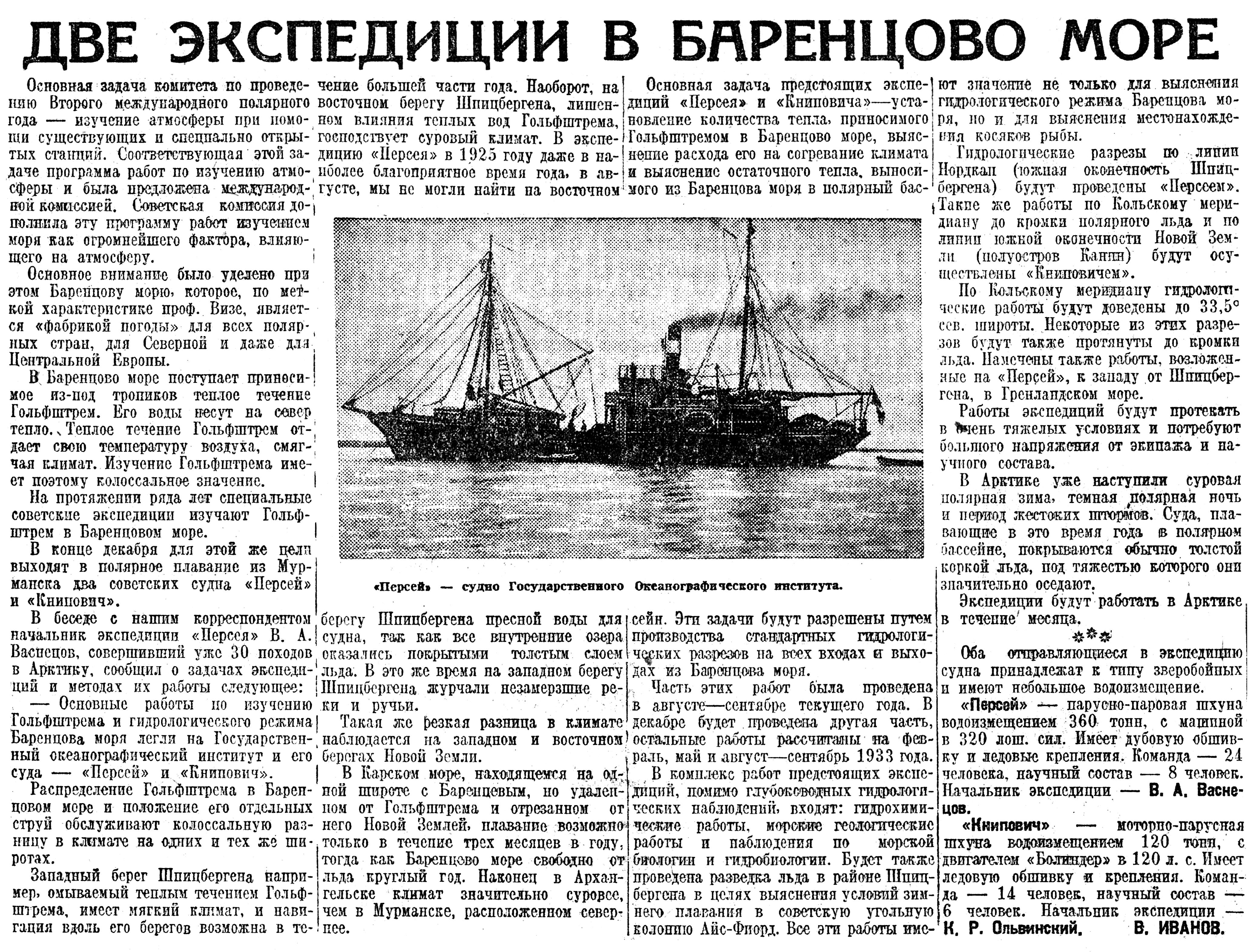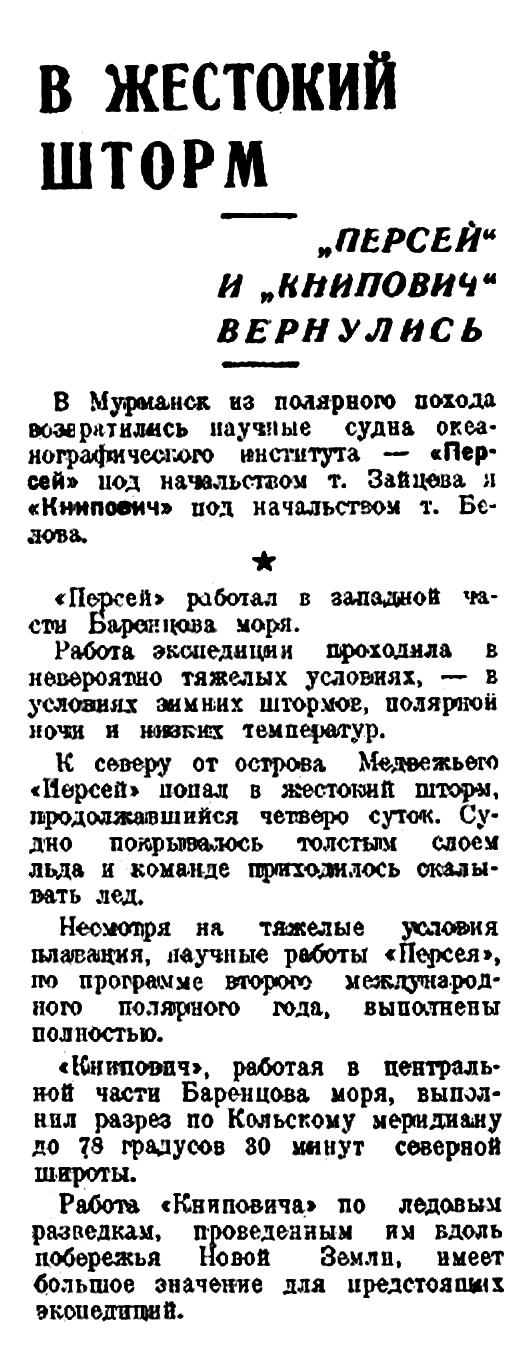 В Мурманск из полярного похода возвратилась научные судна океанографического института — «Персей» под начальством т. Зайцева и «Книпович» под начальством т. Белова.