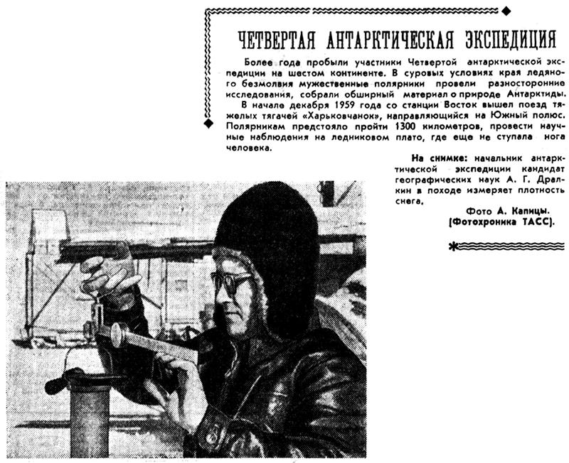 НАУЧНЫЕ ИТОГИОсновной научный поход из южнополярной обсерватории Мирный на Южный полюс был успешно завершен. Он продолжался 98 дней, с 27 сентября 1959 г. до 8 января 1960 г., когда поезд вернулся на станцию Восток. Здесь снегоходы и тягач, проделавшие путь около 4000 км, были законсервированы, а всех участников похода доставили на самолетах в Мирный.