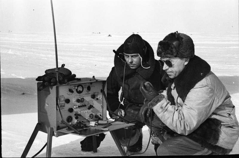 Генерал-майор авиации И.П.Мазурук (справа) лично руководит полётами истребителей Ла-11 и бомбардировщиков Ту-2 на дрейфующем ледовом аэродроме. ВВЭ "Север-5", апрель 1950 г.