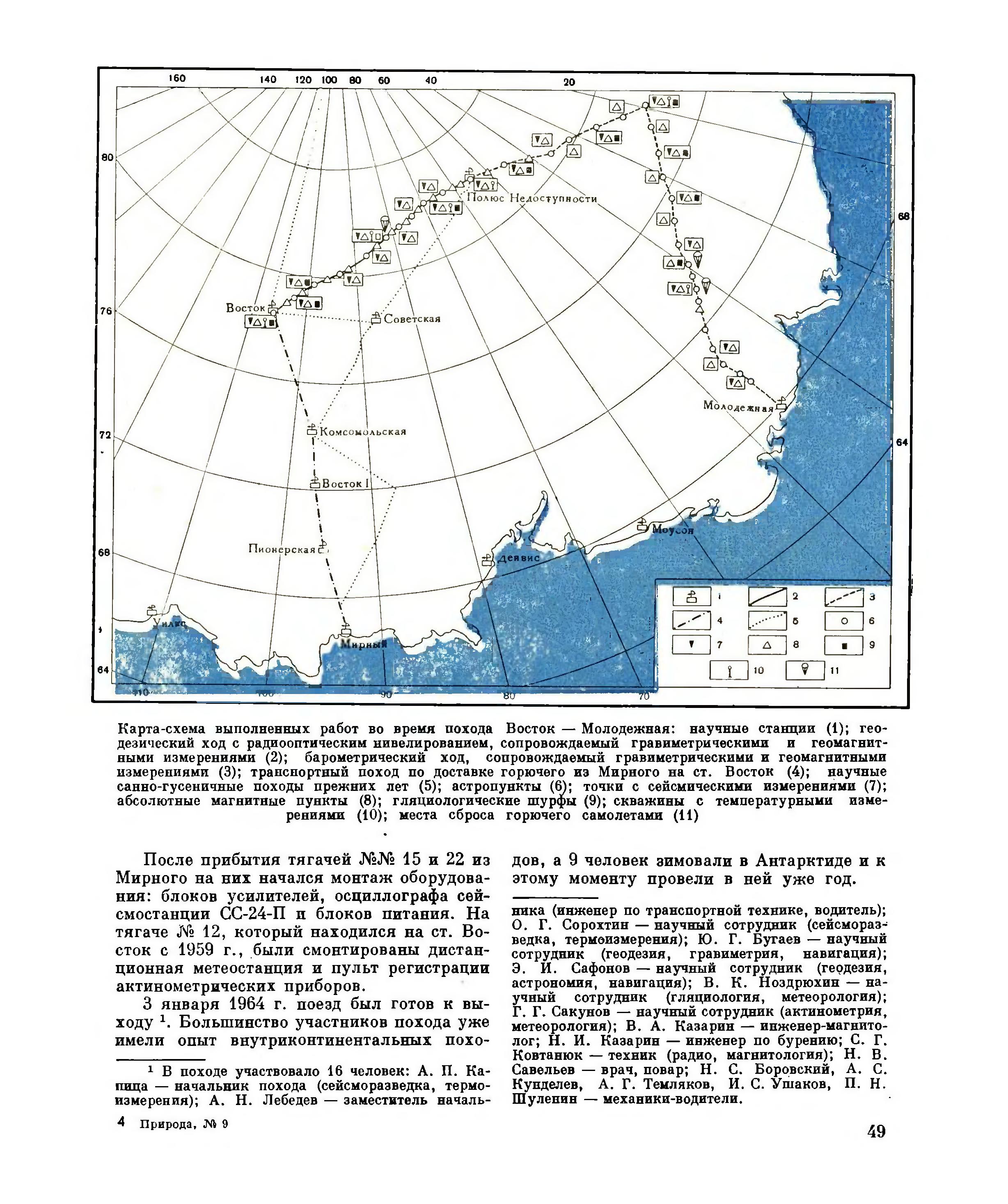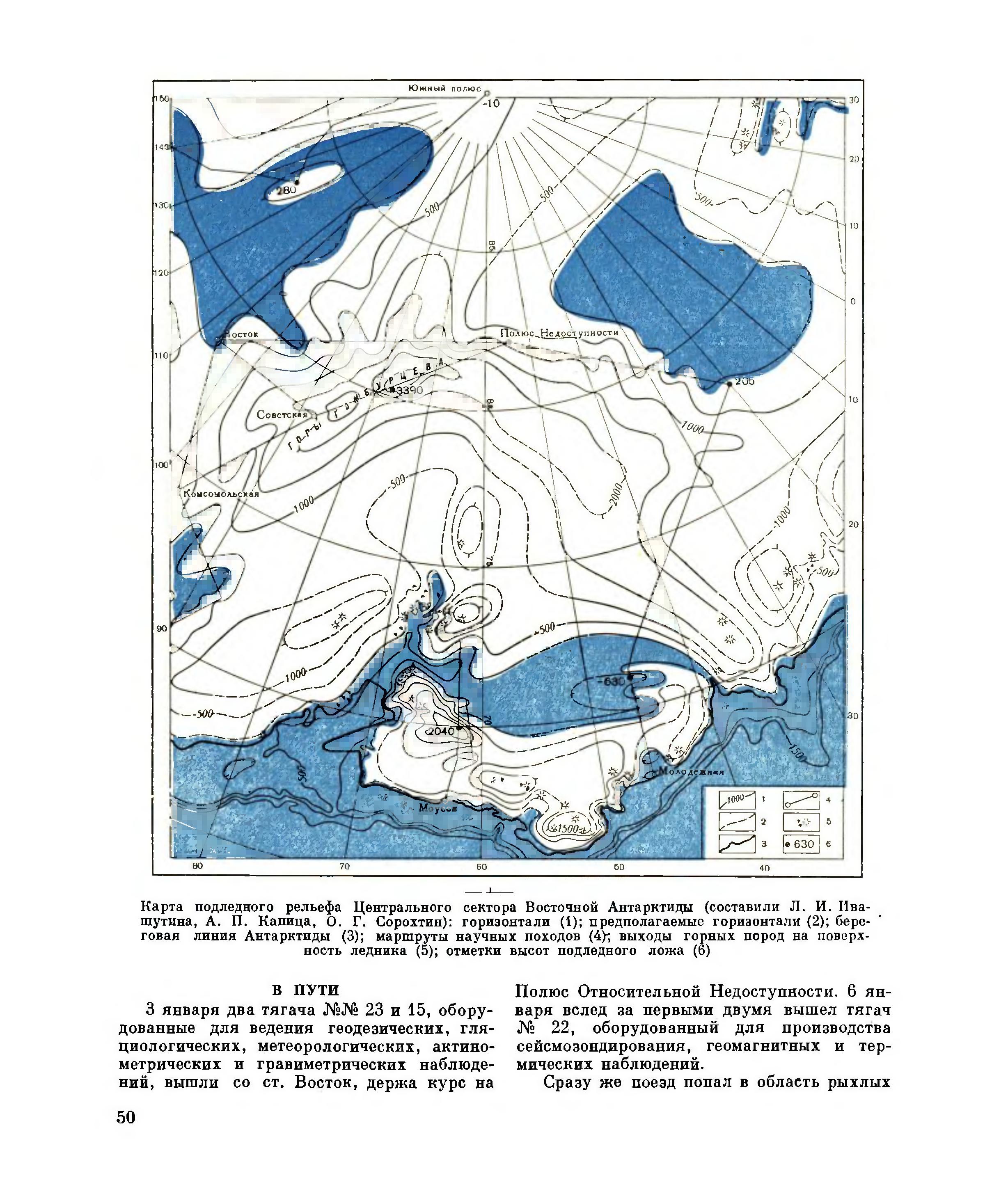 {1} В походе участвовало 16 человек: А. П. Капица — начальник похода (сейсморазведка, термоизмерения); А. Н. Лебедев — заместитель начальника (инженер по транспортной технике, водитель); О. Г. Сорохтин — научный сотрудник (сейсморазведка, термоизмерения); Ю. Г. Бугаев — научный сотрудник (геодезия, гравиметрия, навигация); Э. И. Сафонов — научный сотрудник (геодезия, астрономия, навигация); В. К. Ноздрюхин — научный сотрудник (гляциология, метеорология); Г. Г. Сакунов — научный сотрудник (актинометрия, метеорология); В. А. Казарин — инженер-магнитолог; Н. И. Казарин — инженер по бурению; С. Г. Ковтанюк — техник (радио, магнитология); Н. В. Савельев — врач, повар; Н. С. Боровский, А. С. Кунделев, А. Г. Темляков, И. С. Ушаков, П. Н. Шуленин — механики-водители.В ПУТИ3 января два тягача №№ 23 и 15, оборудованные для ведения геодезических, гляциологических, метеорологических, аксонометрических и гравиметрических наблюдений, вышли со ст. Восток, держа курс на Полюс Относительной Недоступности. 6 января вслед за первыми двумя вышел тягач № 22, оборудованный для производства сейсмозондирования, геомагнитных и термических наблюдений.