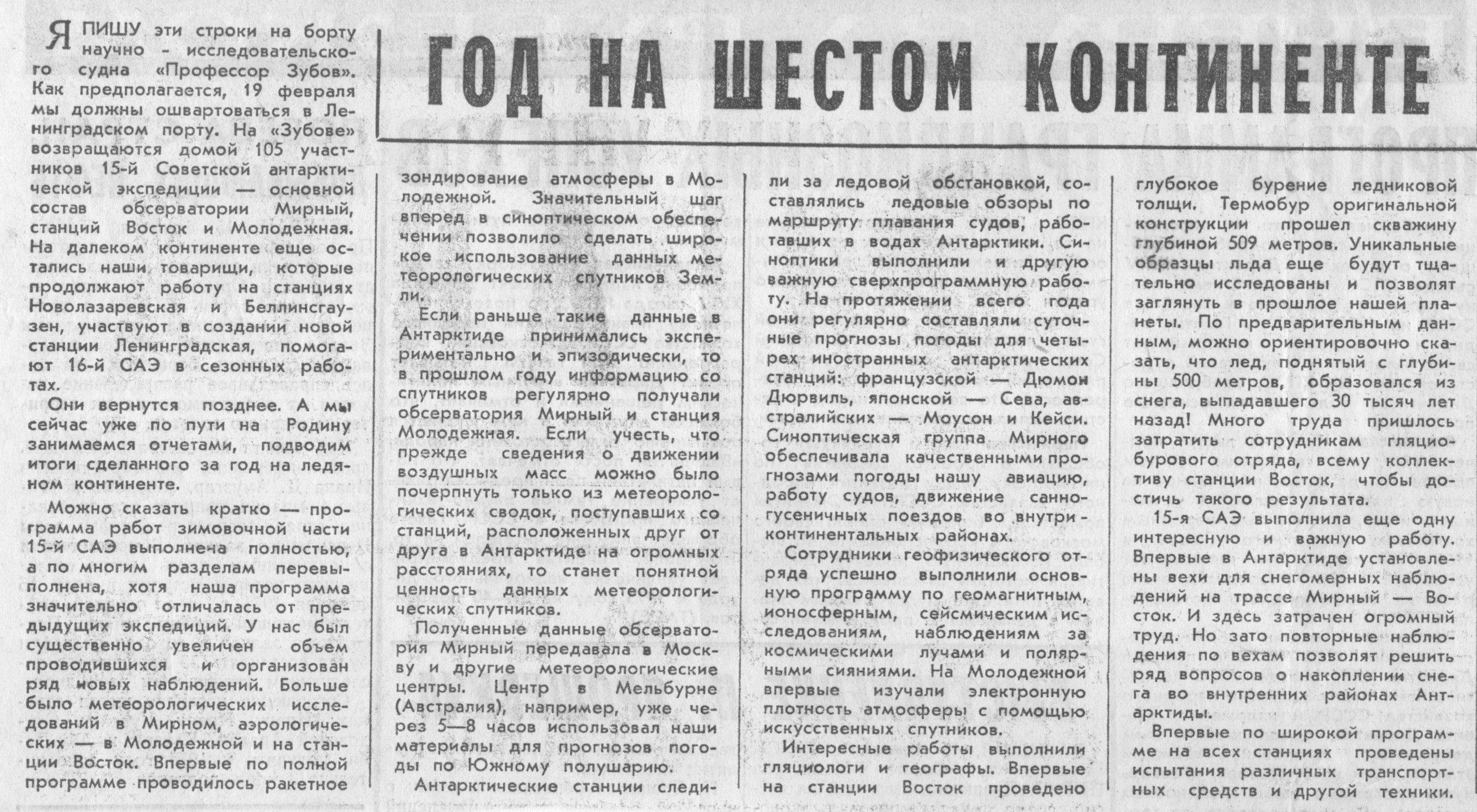 Я ПИШУ эти строки на борту научно - исследовательскоro судна «Профессор Зубов». Как предполагается, 19 февраля мы должны ошвартоваться в Ленинградском порту. На «Зубове» возвращаются домой 105 участников 15-й Советской антарктической экспедиции - основной состав обсерватории Мирный, станций Восток и Молодежная. На далеком континенте еще остались наши товарищи, которые продолжают работу на станциях Новолазаревская и Беллинсгаузен, участвуют в создании новой станции Ленинградская, помогают 16-й САЭ в сезонных работах,