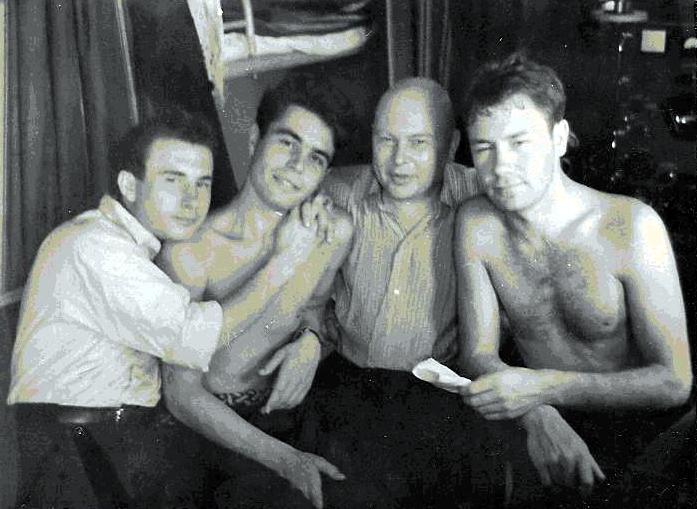 Атлантический океан, экспедиционное судно «Обь», декабрь 1955 года.<br />Это наша группа при переходе экватора <br />Слева направо: Сафонов, Зимин, Ефимов, Евреинов : Слева направо Сафонов Зимин Ефимов Евреинов.JPG