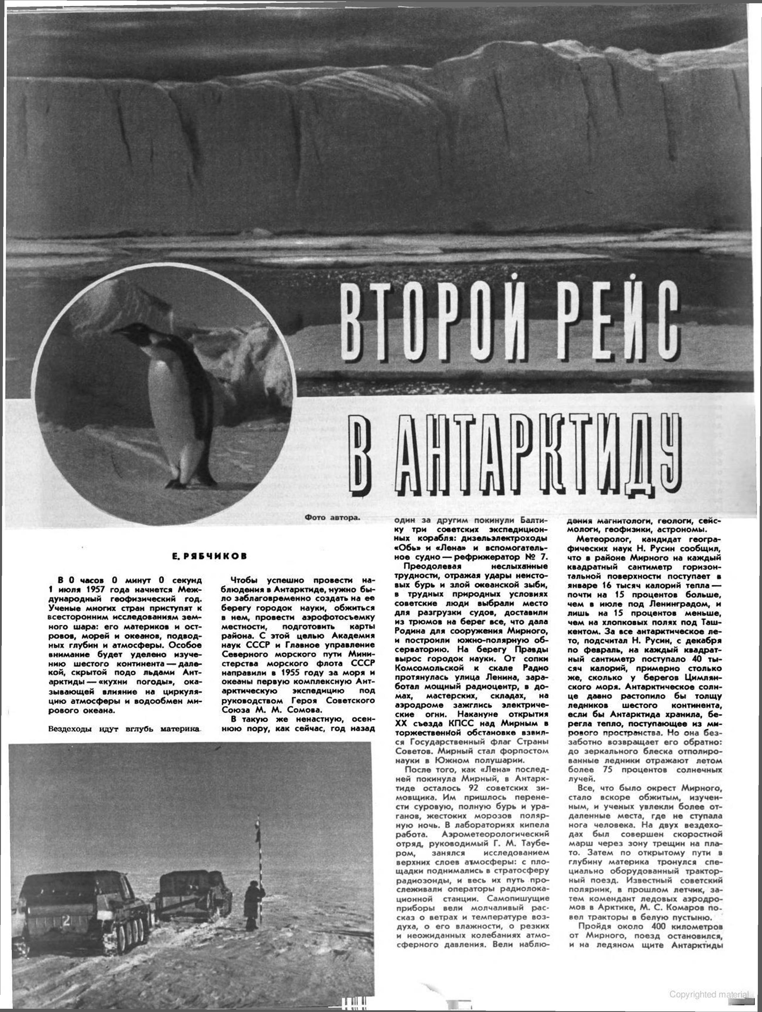 Все, что сделано советскими учеными в Антарктиде, очень важно и нужно. Но это лишь первые шаги. Основные работы развернутся с началом Международного геофизического года, в 1957 году. В связи с этим сейчас организована вторая Антарктическая экспедиция. Уже известные читателям дизель-электроходы «Обь» и «Лена», а также вспомогательное судно «Кооперация» направляются в Мирный. Они доставят к берегу Правды смену зимовщиков, научное снаряжение, продовольствие, самолеты, вездеходы, горючее, разборные дома.
