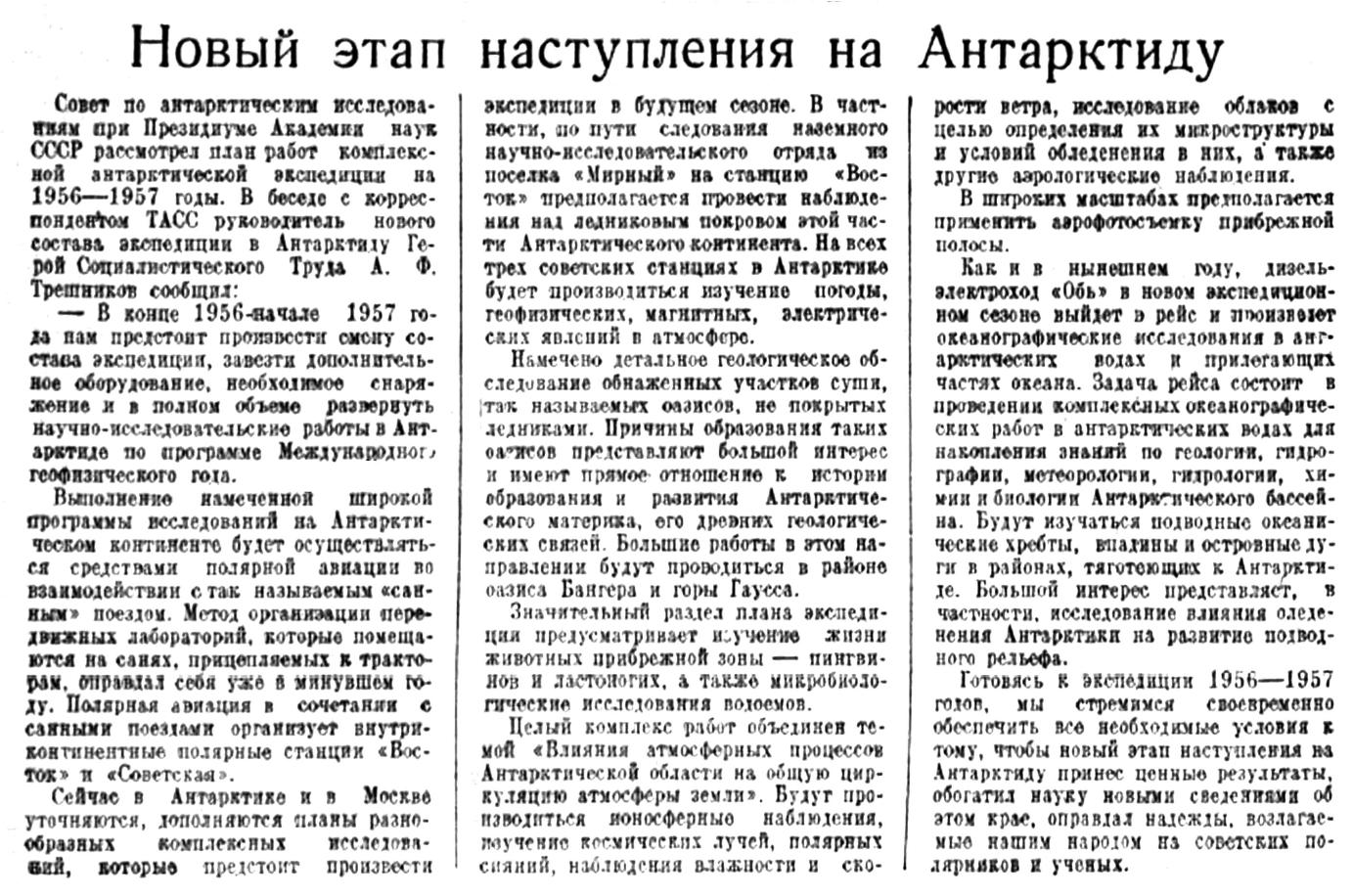 Совет по антарктическим исследованиям при Президиуме Академии наук СССР рассмотрел план работ комплексной антарктической экспедиции на 1956—1957 годы. В беседе с корреспондентом ТАСС руководитель нового состава экспедиции в Антарктиду Герой Социалистического Труда А. Ф. Трешников сообщил: