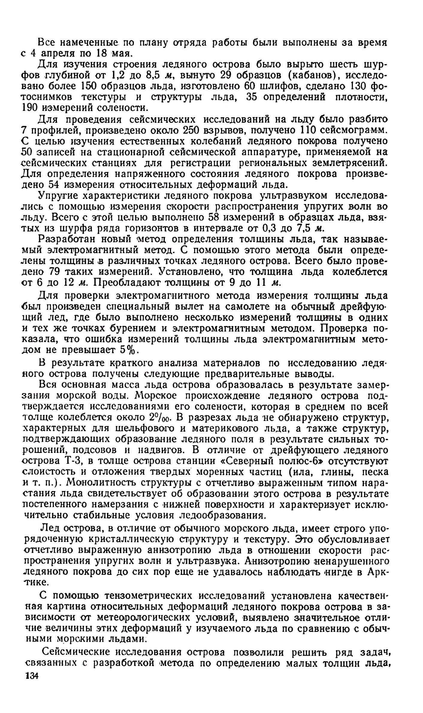 Разработан новый «метод определения толщины льда, так называемый электромагнитный метод. С помощью этого метода были определены толщины а различных точках ледяного острова. Всего было проведено 79 таких измерений. Установлено, что толщина льда колеблется от 6 до 12 м. Преобладают толщины от 9 до 11 м.