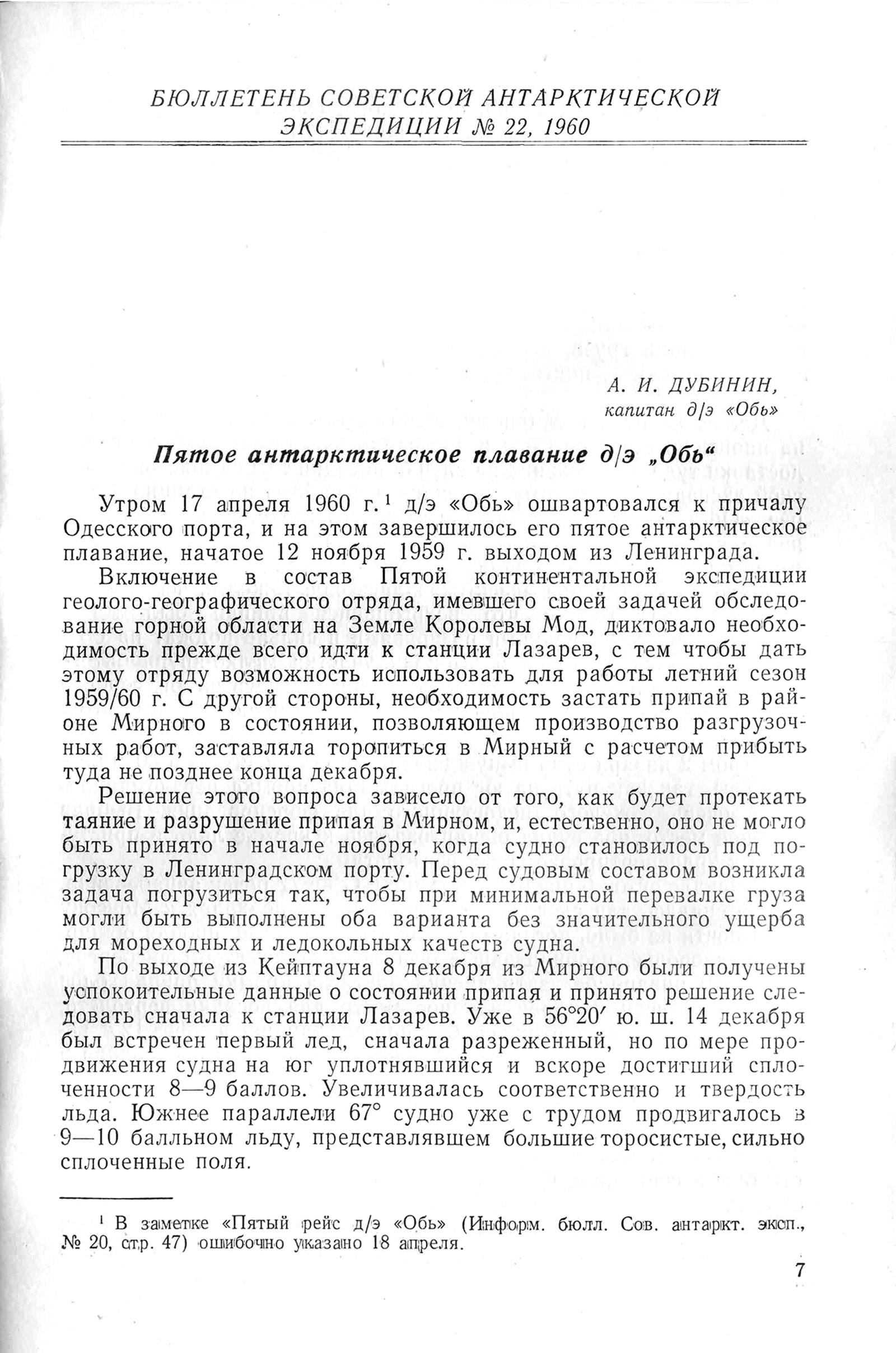 БЮЛЛЕТЕНЬ СОВЕТСКОЙ АНТАРКТИЧЕСКОЙ ЭКСПЕДИЦИИ № 22, 1960, сс. 7—10