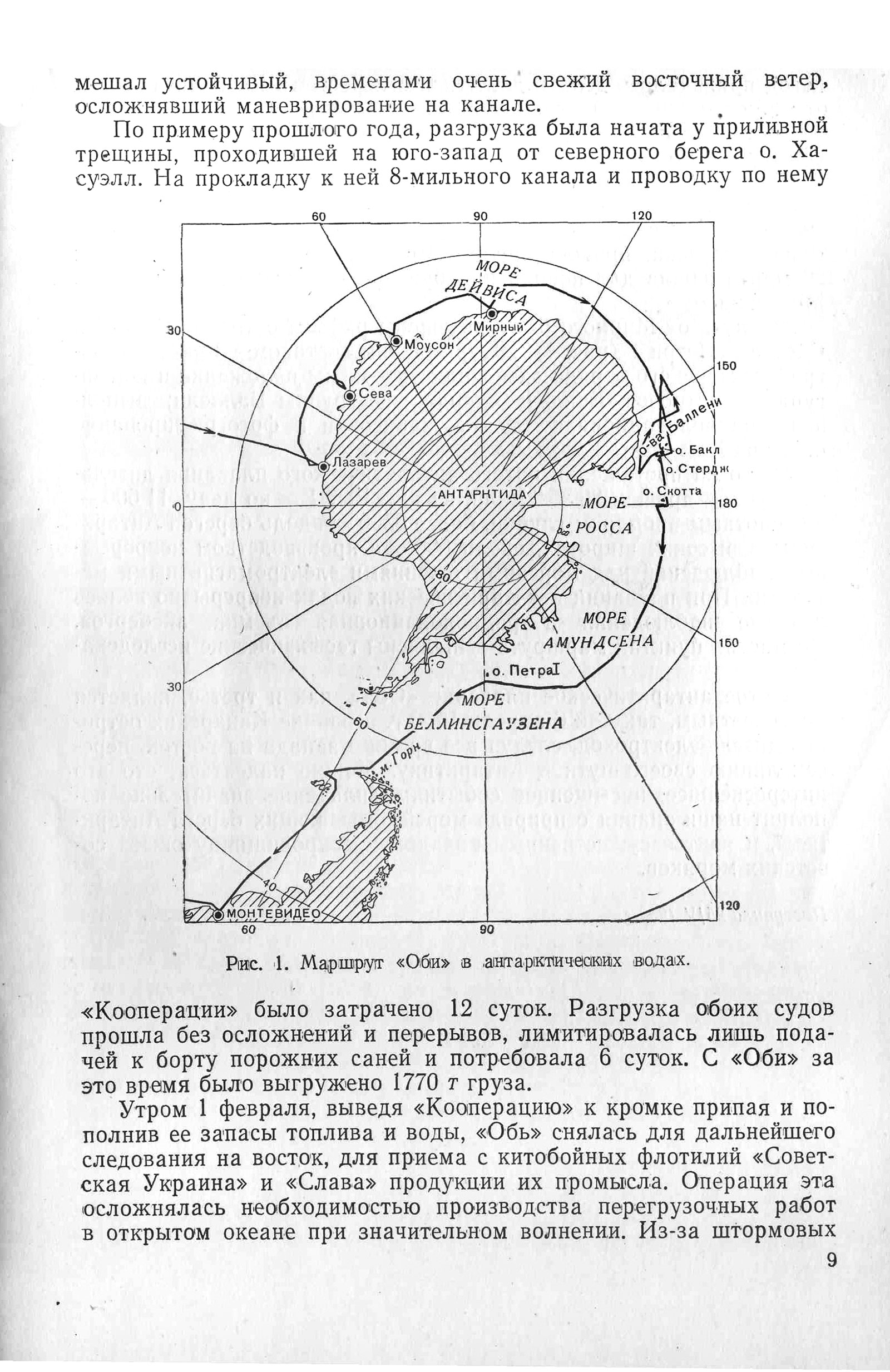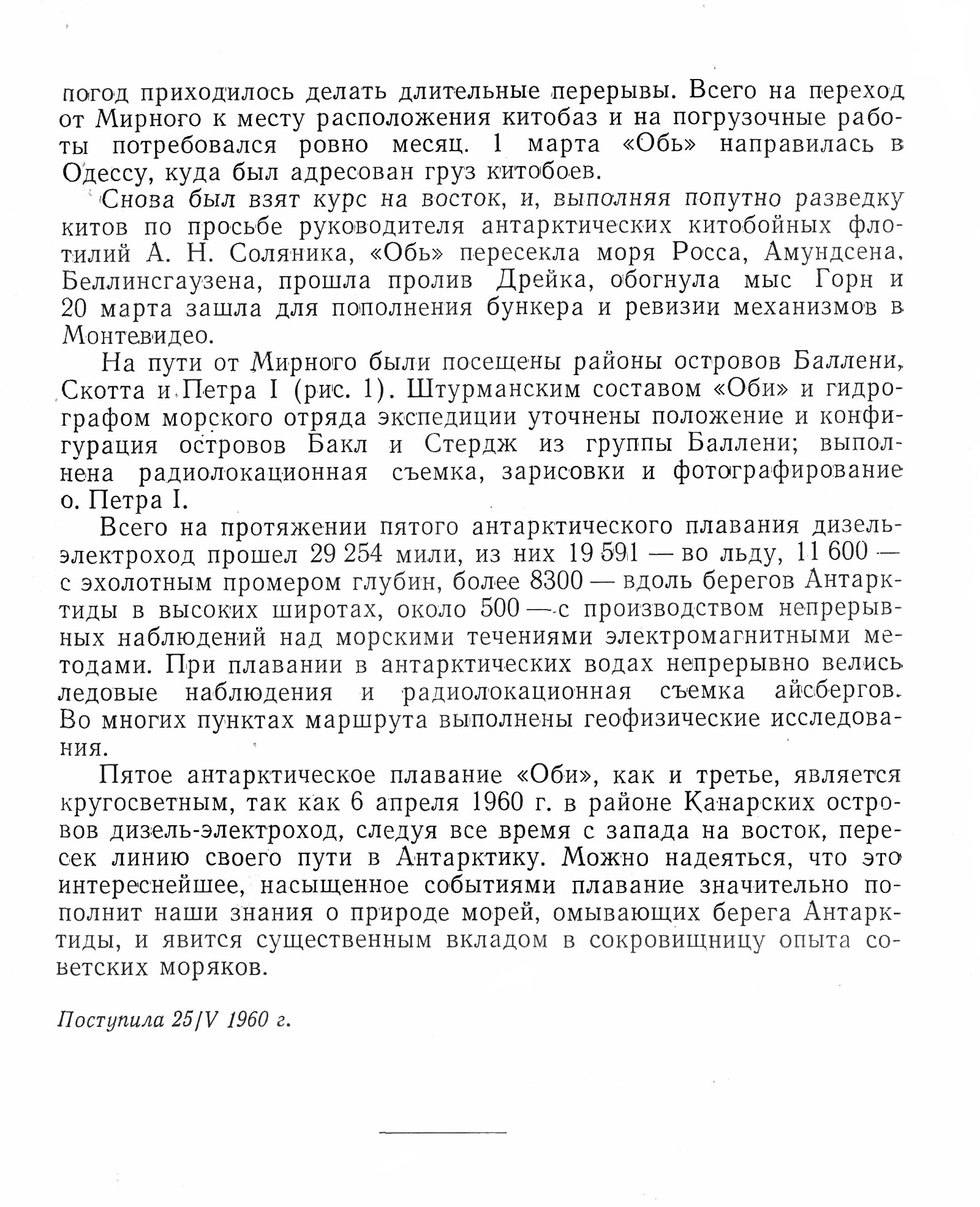 Пятое антарктическое плавание «Оби», как и третье, является кругосветным, так как 6 апреля 1960 г. в районе Канарских островов дизель-электроход, следуя все время с запада на восток, пересек линию своего пути в Антарктику. Можно надеяться, что это интереснейшее, насыщенное событиями плавание значительно пополнит наши знания о природе морей, омывающих берега Антарктиды, и явится существенным вкладом в сокровищницу опыта советских моряков.