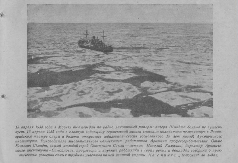 Ни в одной стране арктические исследования не пользуются такой популярностью и глубоким сочувствием самых широких масс, как в Советском Союзе. Об этом с поразительной яркостью свидетельствует то исключительное внимание, которым сопровождалась знаменитая эпопея мужественных челюскинцев во главе с проф. О. Ю. Шмидтом.