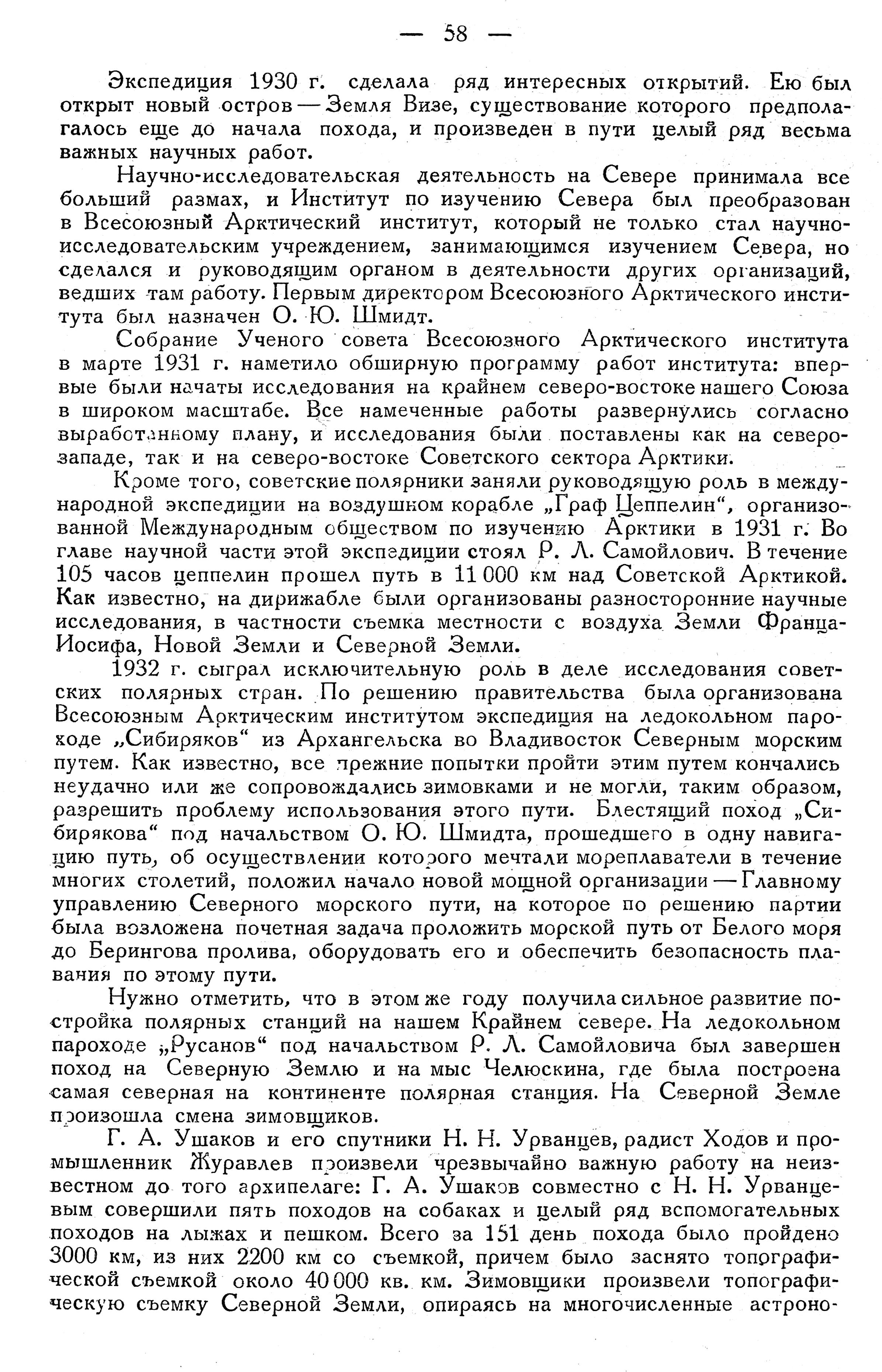 Кроме того, советские полярники заняли руководящую роль в международной экспедиции на воздушном корабле „Граф Цеппелин", организованной Международным обществом по изучению Арктики в 1931 г. Во главе научной части этой экспедиции стоял Р. Л. Самойлович. В течение 105 часов цеппелин прошел путь в 11 000 км над Советской Арктикой. Как известно, на дирижабле были организованы разносторонние научные исследования, в частности съемка местности с воздуха Земли Франца-Иосифа, Новой Земли и Северной Земли.