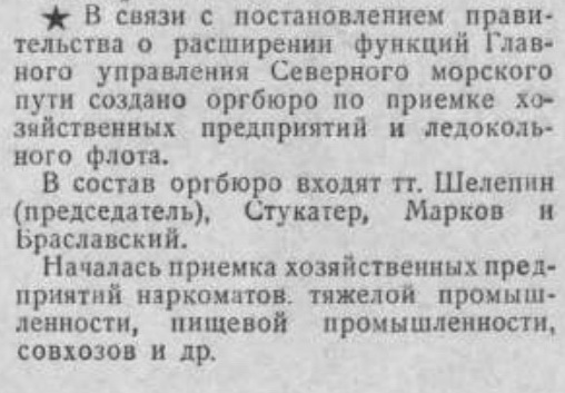 Совнарком Союза ССР и ЦК ВКП (б) признали необходимым создать политотделы и ввести институт парторгов в систему Главного Управления Северного Морского Пути. (ТАСС).