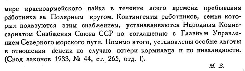 ЛЬГОТЫ ДЛЯ РАБОТНИКОВ ГУСМП, РАБОТАЮЩИХ ЗА ПОЛЯРНЫМ КРУГОМ. К работникам Главного Управления Северного морского пути, работающим за Полярным кругом, полностью применяется положение о льготах для лиц, работающих на крайнем севере, с распространением на них особых льгот, установленных этим положением для работников Мурманского округа. Сверх этого в учреждениях, на судах и в составе экспедиций ГУСМП за Полярным кругом допускается работа членов семьи в непосредственном подчинении друг у друга. Семьи работающих за Полярным кругом обеспечиваются продовольственным снабжением в размере красноармейского пайка в течение всего времени пребывания работника за Полярным кругом. Контингенты работников, семьи которых пользуются этим снабжением, устанавливаются Народным Комиссариатом Снабжения Союза ССР по соглашению с Главным Управлением Северного морского пути. Помимо этого, установлены особые льготы в отношении пенсии по случаю потери кормильца и по инвалидности. (Свод законов 1933, № 44, ст. 265, отд. I).