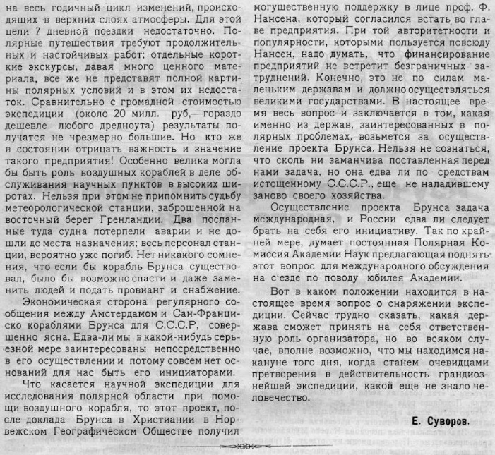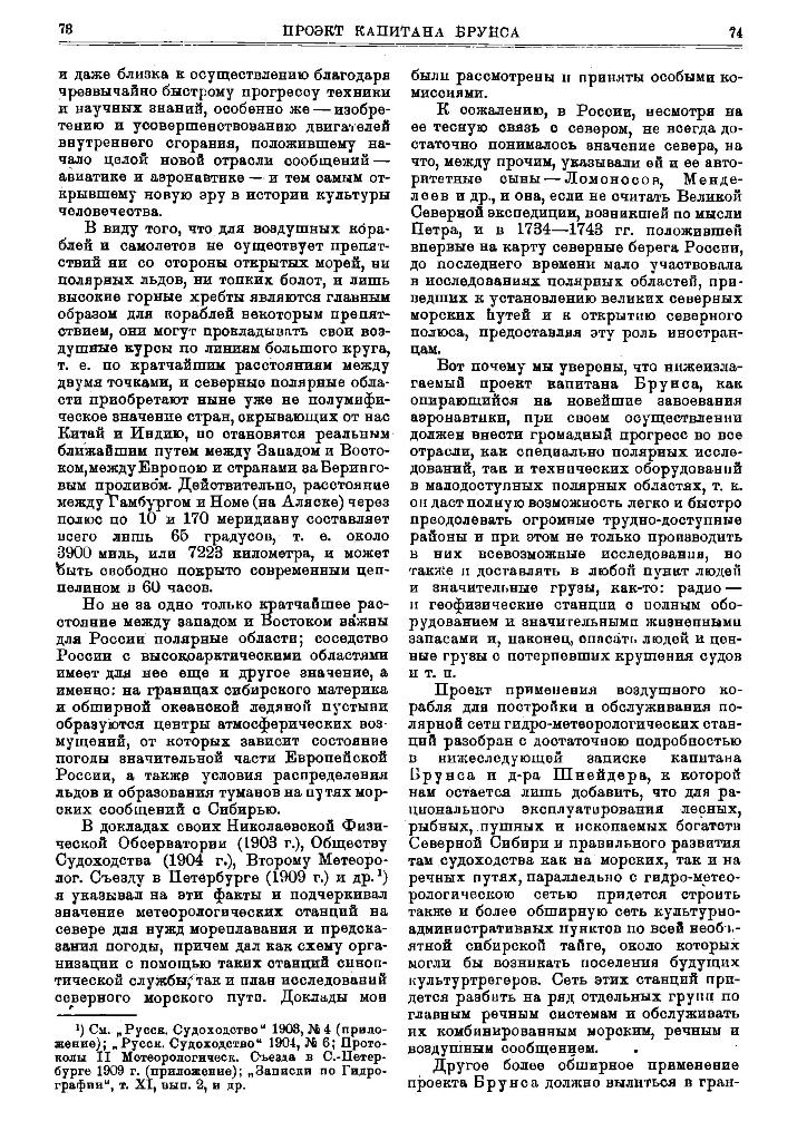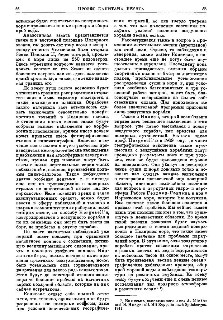 Вот почему мы уверены, что нижеизлагаемый проект капитана Брунса, как опирающийся на новейшие завоевания аэронавтики, при своем осуществлении должен внести громадный прогресс во все отрасли, как специально полярных исследований, так и технических оборудований в малодоступных полярных областях, т. к. он даст полную возможность легко и быстро преодолевать огромные трудно-доступные районы и при этом не только производить в них всевозможные исследования, но также и доставлять в любой пункт людей и значительные грузы, как-то: радио — и геофизические станции о полным оборудованием и значительными жизненными запасами и, наконец, спасать людей и ценные грузы с потерпевших крушения судов и т. п.