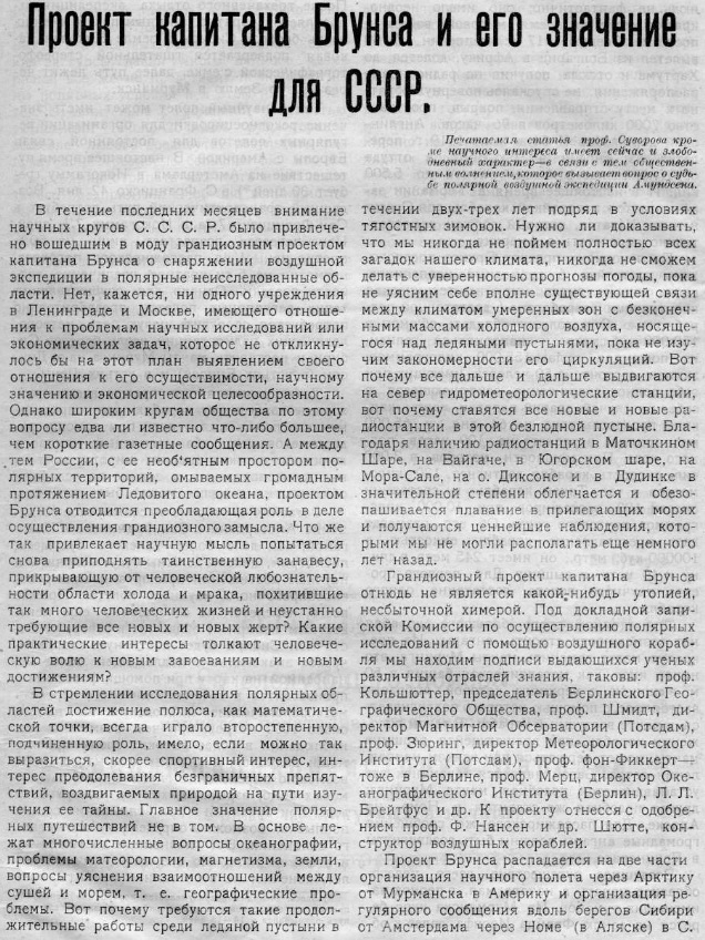 Под моим председательством в радиевом институте состоится особое заседание, находяшееся в связи с рассматривавшемся недавно в Совнаркоме вопросом об участии СССР в разработке проекта известного германского воздухоплавателя, капитана В. Брунса, об организации через северную территорию республика постоянного трансарктического пути из Европы к берегам Берингова пролива.