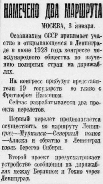 Осоавиахим СССР принимает участие в открывающемся в Ленинграде в июне 1928 года конгрессе международного общества по изучению полярных стран на дирижаблях.