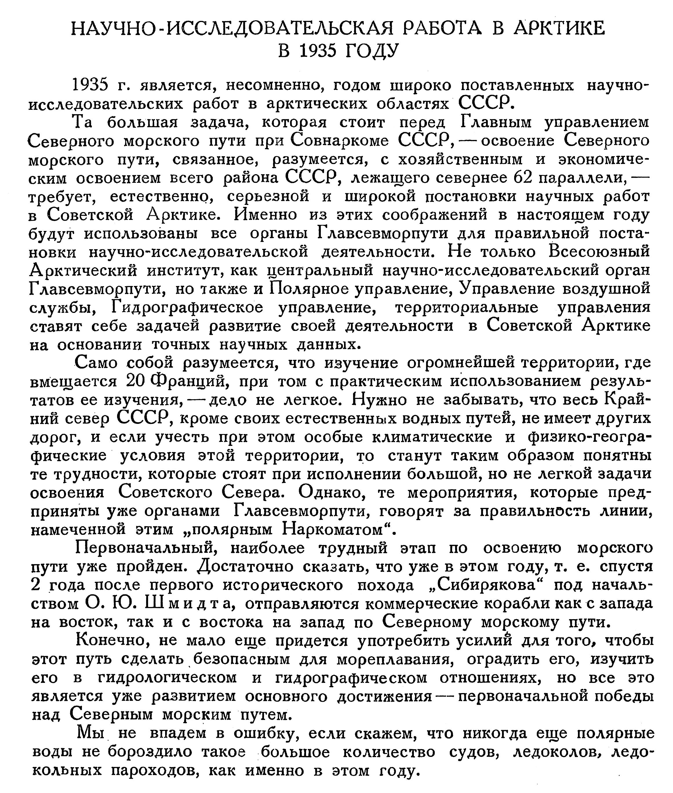 Та большая задача, которая стоит перед Главным управлением Северного морского пути при Совнаркоме СССР, — освоение Северного морского пути, связанное, разумеется, с хозяйственным и экономическим освоением всего района СССР, лежащего севернее 62 параллели, — требует, естественно, серьезной и широкой постановки научных работ в Советской Арктике. Именно из этих соображений в настоящем году будут использованы все органы Главсевморпути для правильной постановки научно-исследовательской деятельности. Не только Всесоюзный Арктический институт, как центральный научно-исследовательский орган Главсевморпути, но также и Полярное управление, Управление воздушной службы, Гидрографическое управление, территориальные управления ставят себе задачей развитие своей деятельности в Советской Арктике на основании точных научных данных.