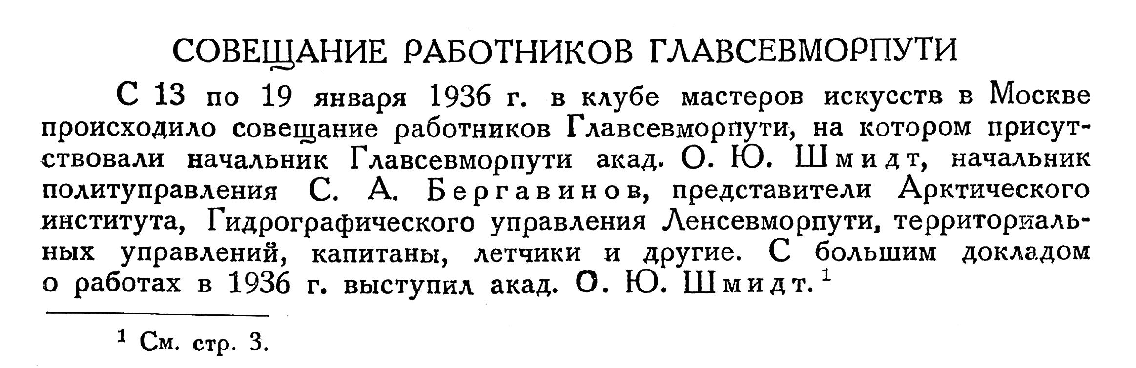 С 13 по 19 января 1936 г. в клубе мастеров искусств в Москве происходило совещание работников Главсевморпути, на котором присутствовали начальник Главсевморпути акад. О. Ю. Шмидт, начальник политуправления С. А. Бергавинов, представители Арктического института, Гидрографического управления Ленсевморпути, территориальных управлений, капитаны, летчики и другие. С большим докладом о работах в 1936 г. выступил акад. О. Ю. Шмидт. 1)