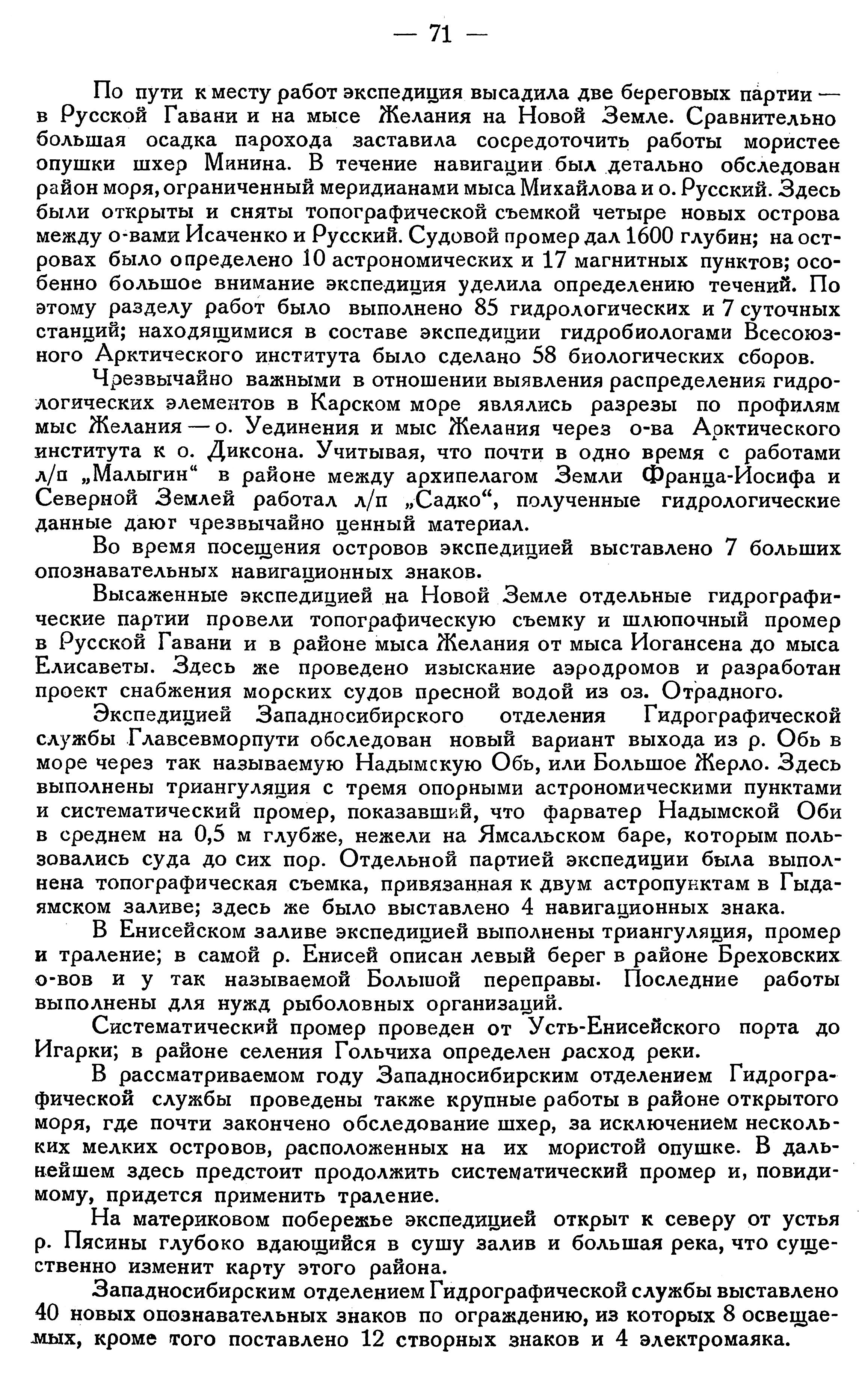 Экспедицией Западносибирского отделения Гидрографической службы Главсевморпути обследован новый вариант выхода из р. Обь в море через так называемую Надымскую Обь, или Большое Жерло. Здесь выполнены триангуляция с тремя опорными астрономическими пунктами и систематический промер, показавший, что фарватер Надымской Оби в среднем на 0, 5 м глубже, нежели на Ямсальском баре, которым пользовались суда до сих пор. Отдельной партией экспедиции была выполнена топографическая съемка, привязанная к двум астропунктам в Гыдаямском заливе; здесь же было выставлено 4 навигационных знака.