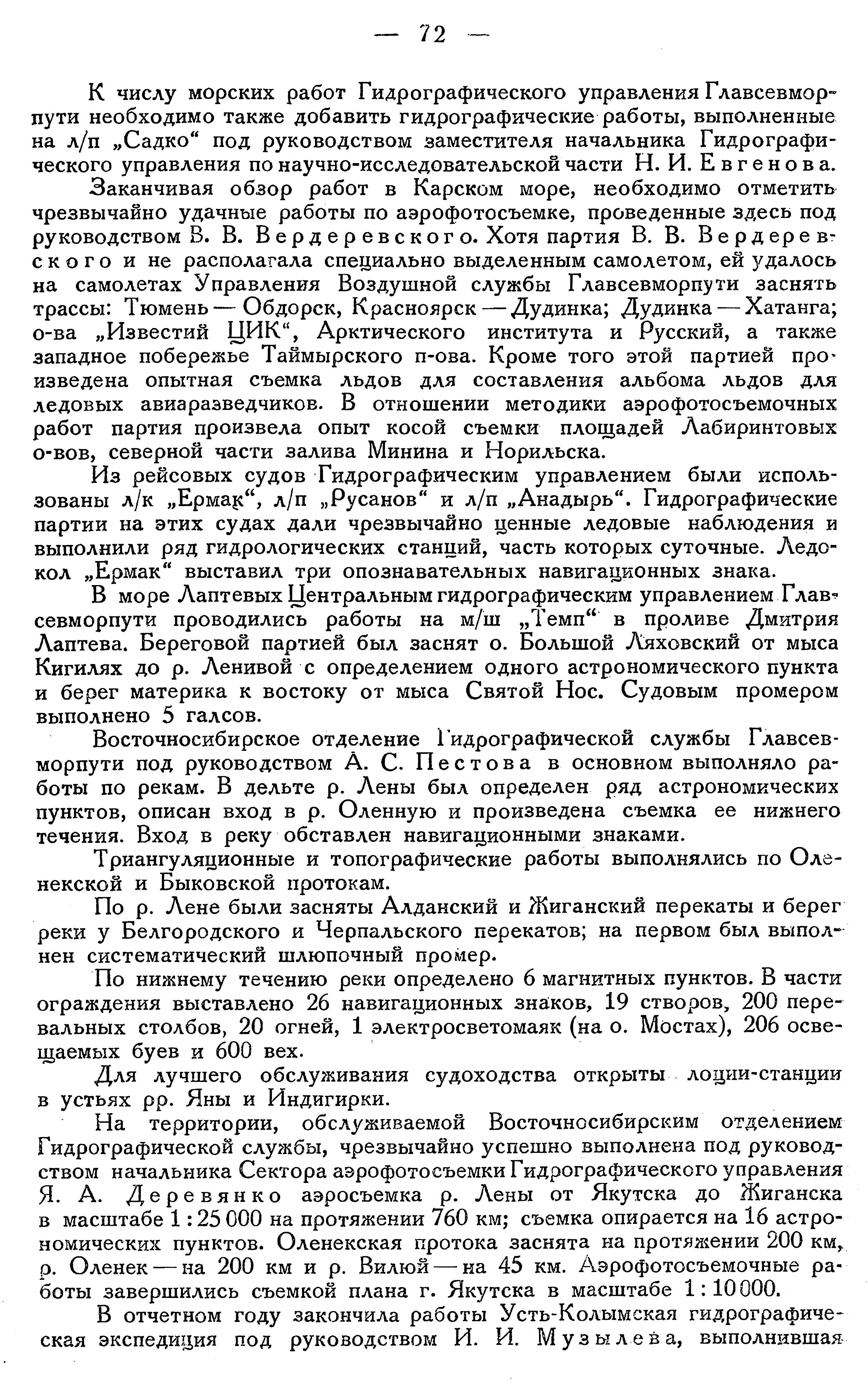 Из рейсовых судов Гидрографическим управлением были использованы л/к „Ермаке", л/п „Русанов" и л/п „Анадырь". Гидрографические партии на этих судах дали чрезвычайно ценные ледовые наблюдения и выполнили ряд гидрологических станций, часть которых суточные. Ледокол „Ермак" выставил три опознавательных навигационных знака.