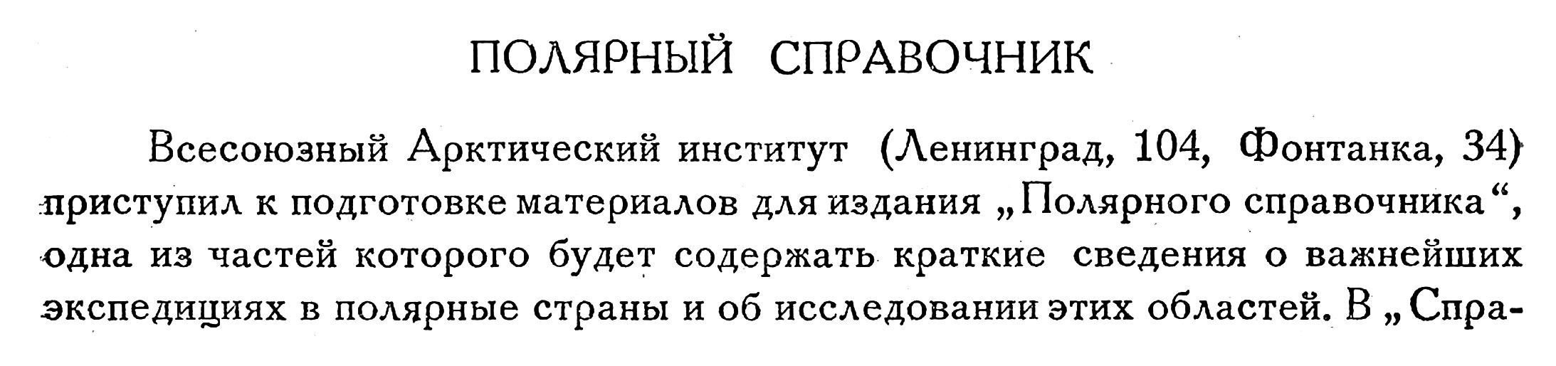 Всесоюзный Арктический институт (Ленинград, 104, Фонтанка, 34) приступил к подготовке материалов для издания „Полярного справочника", одна из частей которого будет содержать краткие сведения о важнейших экспедициях в полярные страны и об исследовании этих областей. В „ Справочник“ включается также библиографический указатель по возможности всех исследователей Арктики и Антарктики. Кроме того, в „Справочнике“ будет дан толковый словарь главнейших географических имен, относящихся к полярным областям, и терминов, им свойственных.