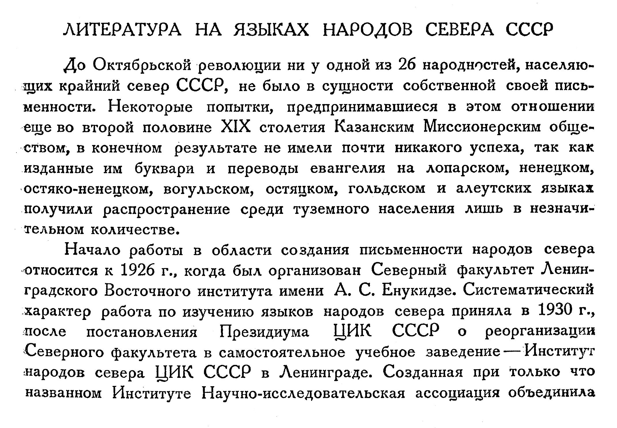 До Октябрьской революции ни у одной из 26 народностей, населяющих крайний север СССР, не было в сущности собственной своей письменности. Некоторые попытки, предпринимавшиеся в этом отношении еще во второй половине XIX столетия Казанским Миссионерским обществом, в конечном результате не имели почти никакого успеха, так как изданные им буквари и переводы евангелия на лопарском, ненецком, остяко-ненецком, вогульском, остяцком, гольдском и алеутских языках получили распространение среди туземного населения лишь в незначительном количестве.