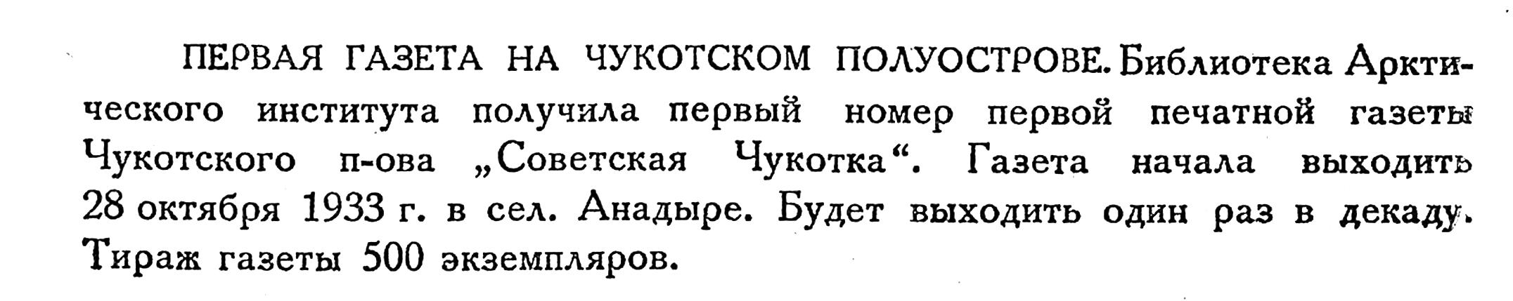 ПЕРВАЯ ГАЗЕТА НА ЧУКОТСКОМ ПОЛУОСТРОВЕ. Библиотека Арктического института получила первый номер первой печатной газеты Чукотского п-ова „Советская Чукотка". Газета начала выходить 28 октября 1933 г. в сел. Анадыре. Будет выходить один раз в декаду. Тираж газеты 500 экземпляров.