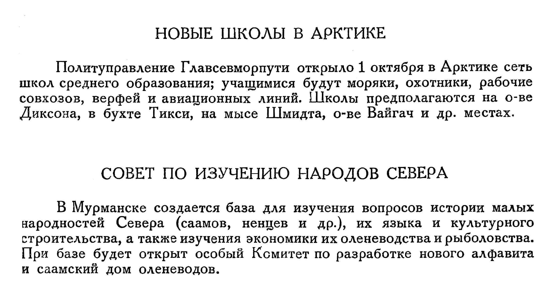 Политуправление Главсевморпути открыло 1 октября в Арктике сеть школ среднего образования; учащимися будут моряки, охотники, рабочие совхозов, верфей и авиационных линий. Школы предполагаются на о-ве Диксона, в бухте Тикси, на мысе Шмидта, о-ве Вайгач и др. местах.