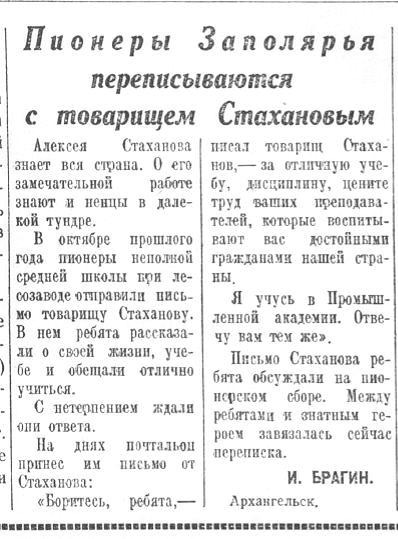 Брагин И.П и о н е р ы Заполярья переписываются с товарищем Стахановым//Пионерская правда 25 января 1939 № 12 (2182)